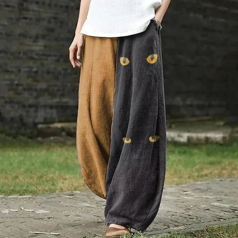 Black Cat Art Print Wide Leg Trousers - Kawaii Harajuku Loose Pocket Casual Pants