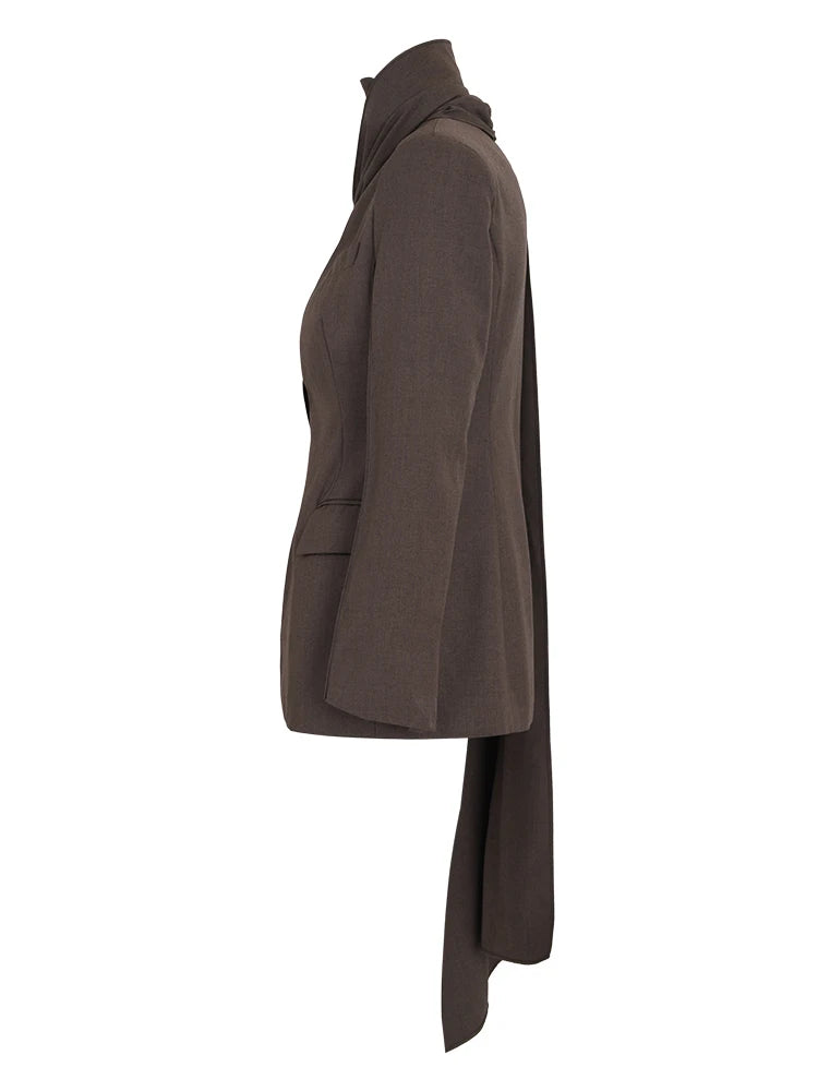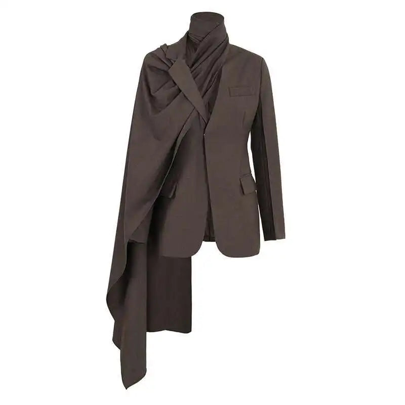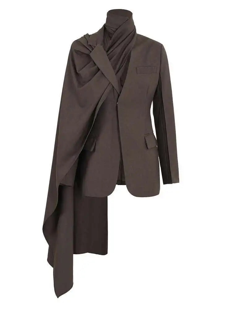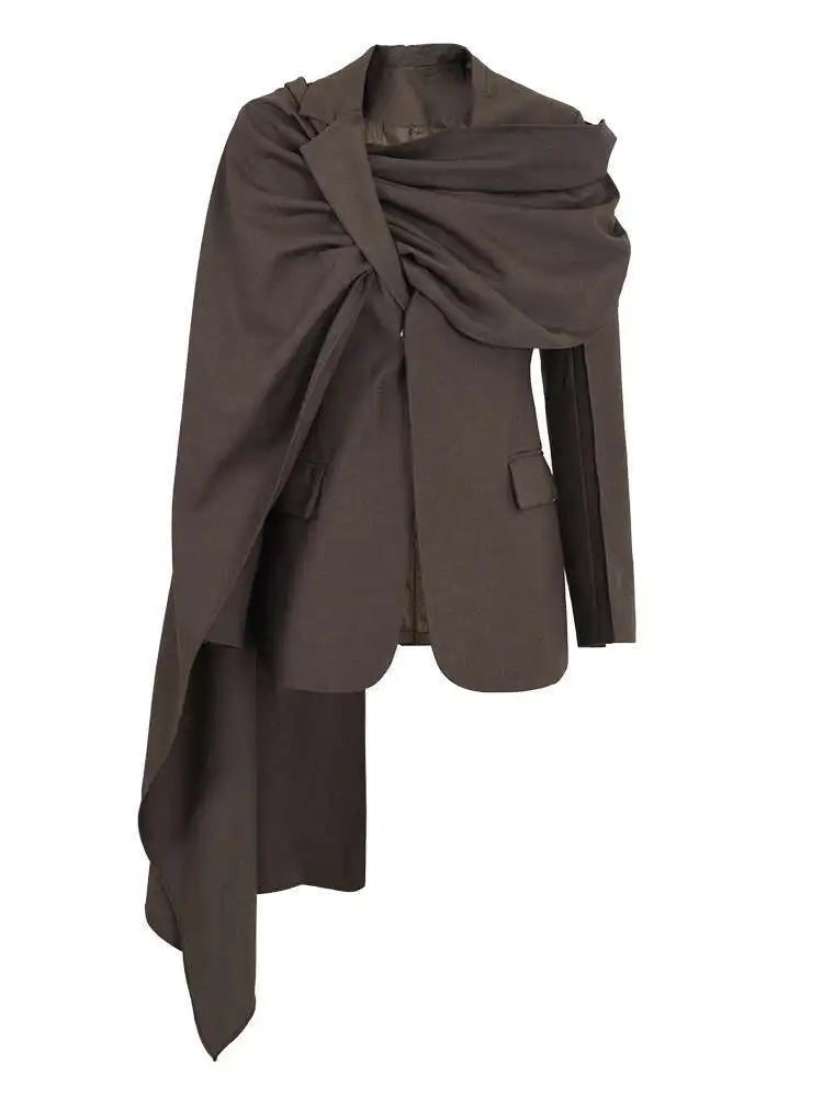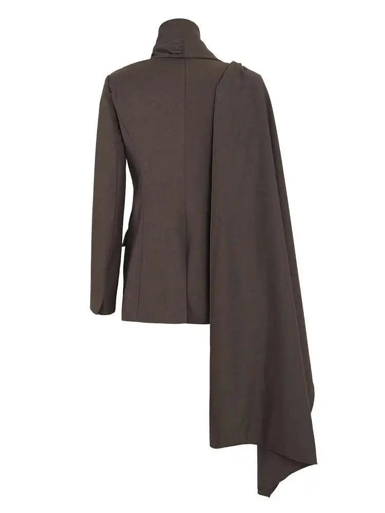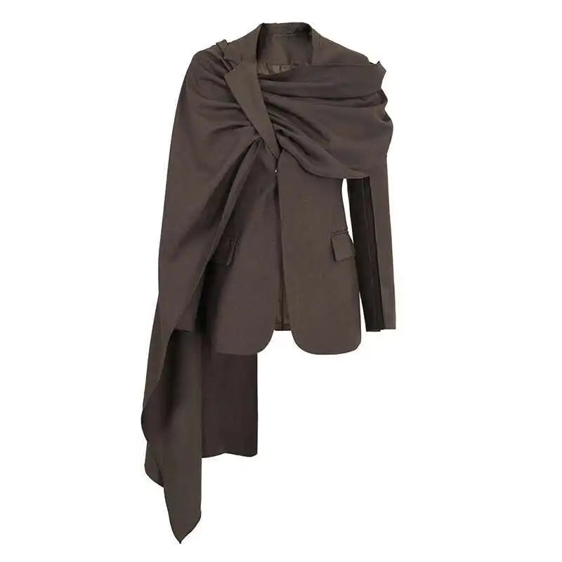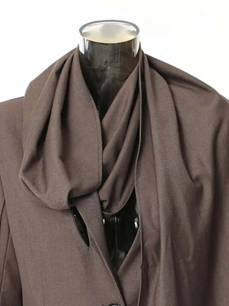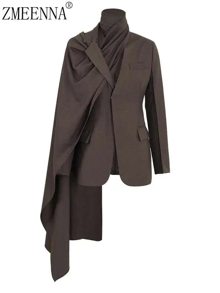 Elegant Women's Coffee Blazer with Irregular Scarf Lapel, Long Sleeve, Loose Fit for Spring/Autumn Fashion 2024