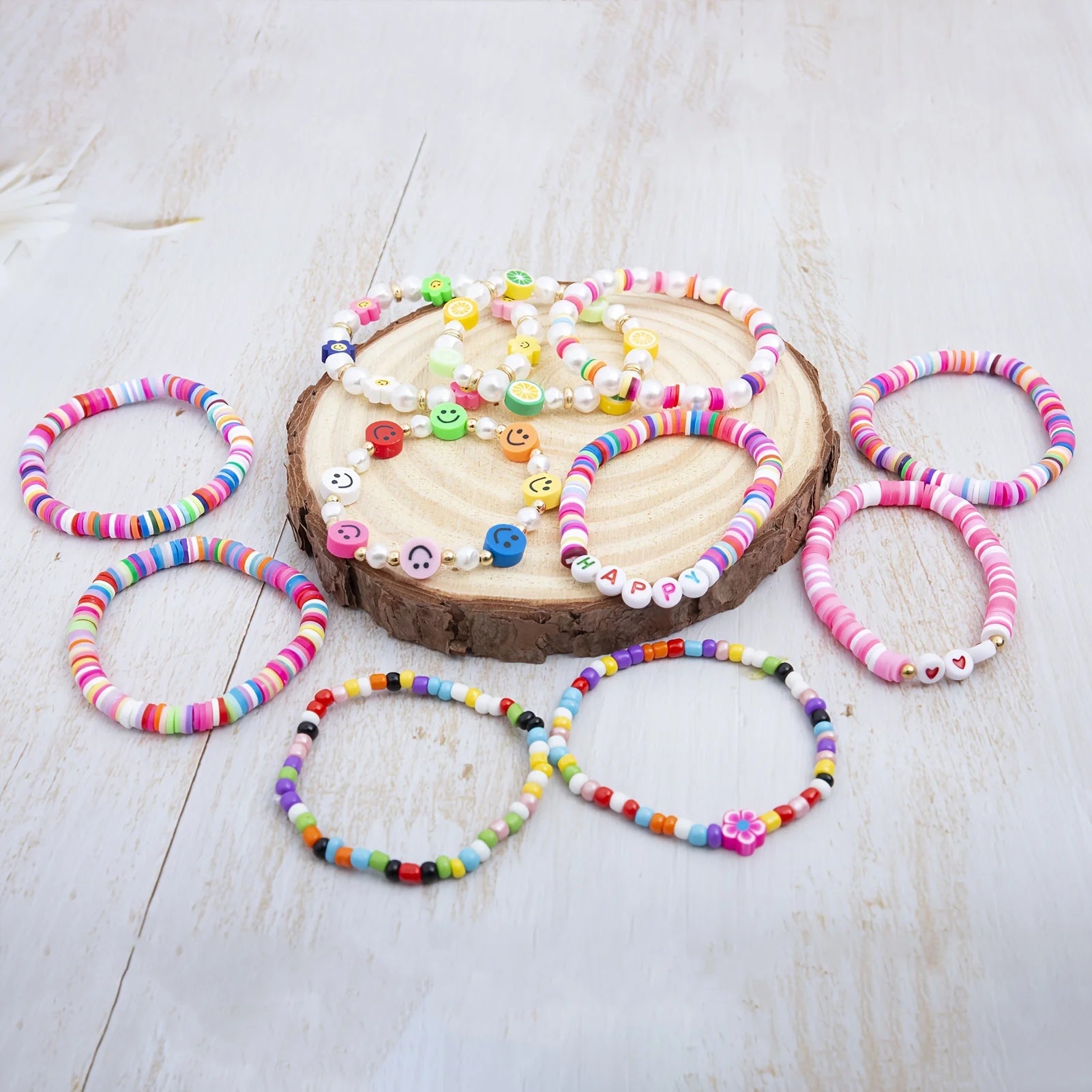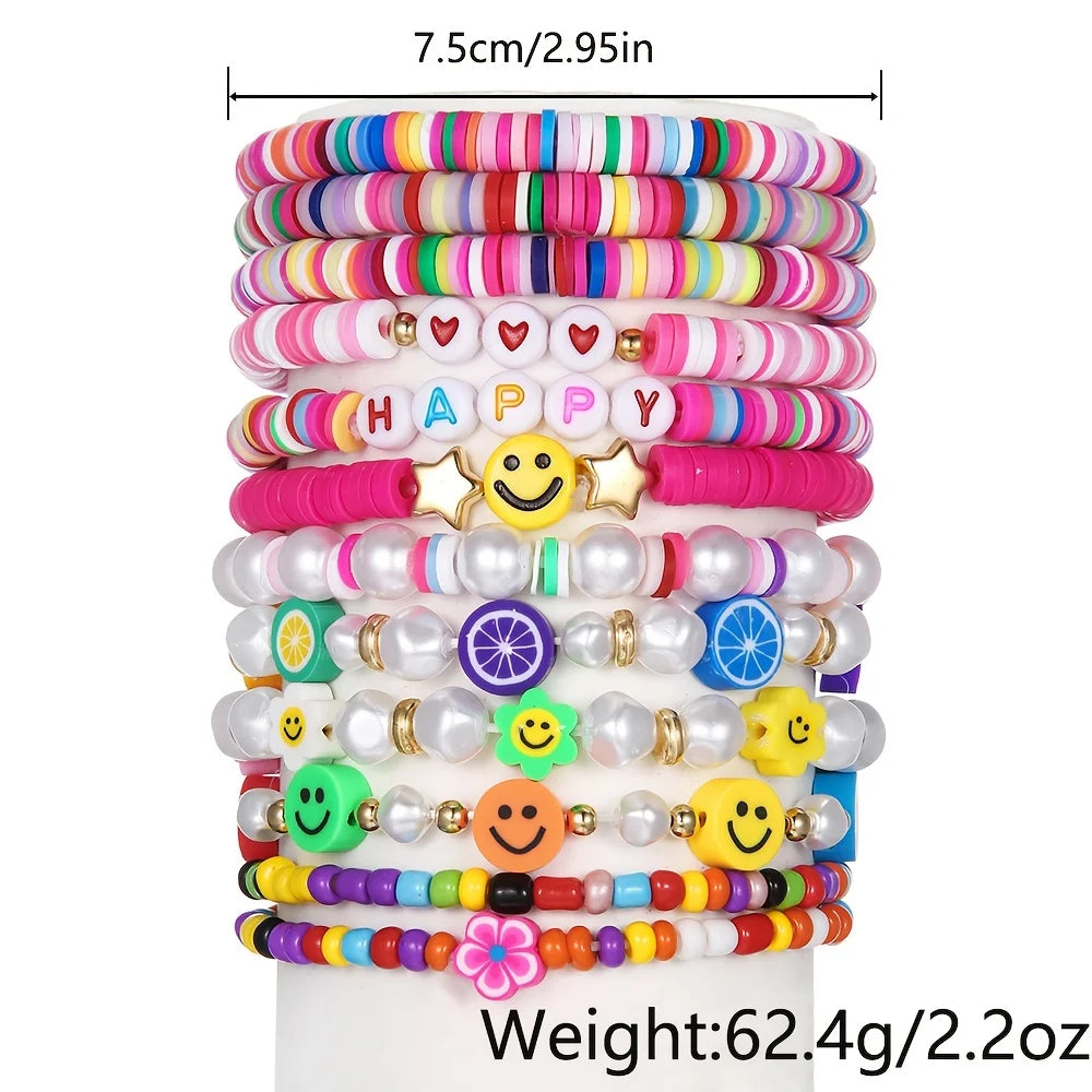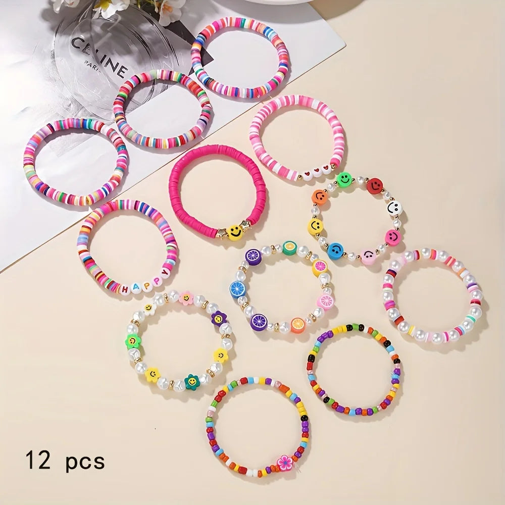 12pcs Boho Chic Polymer Clay Bracelets Set - Summer Fashion Smile Beads for Girls
