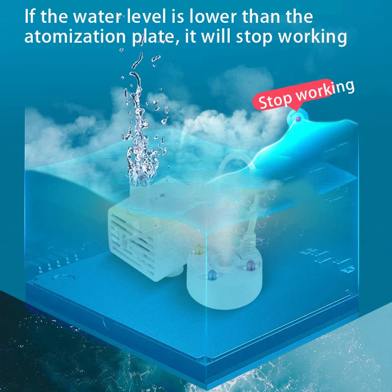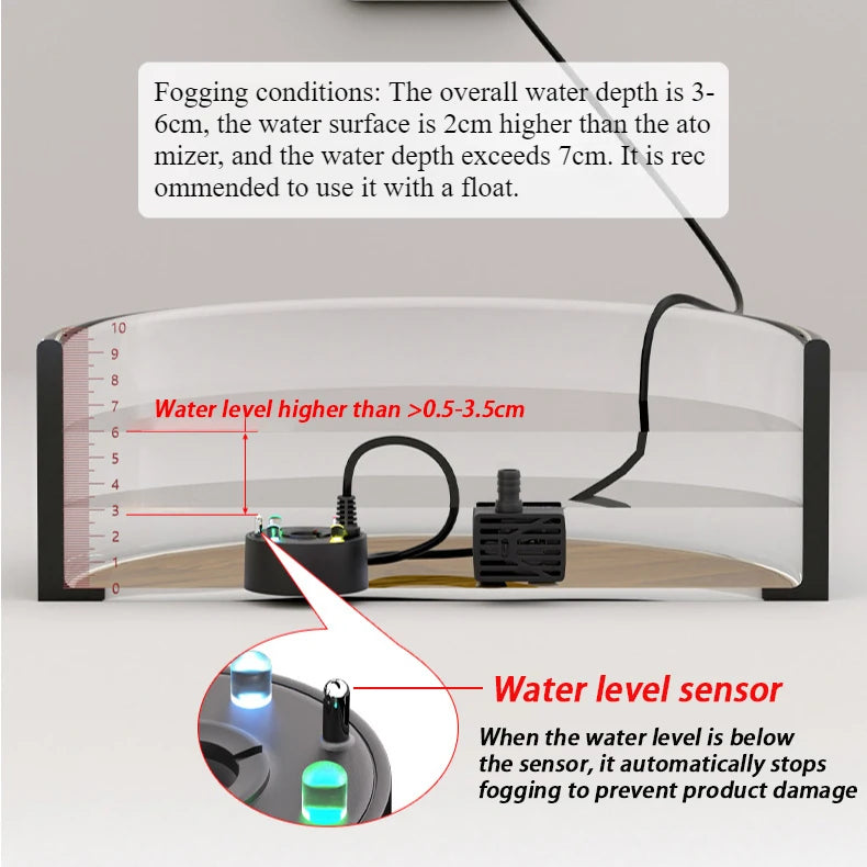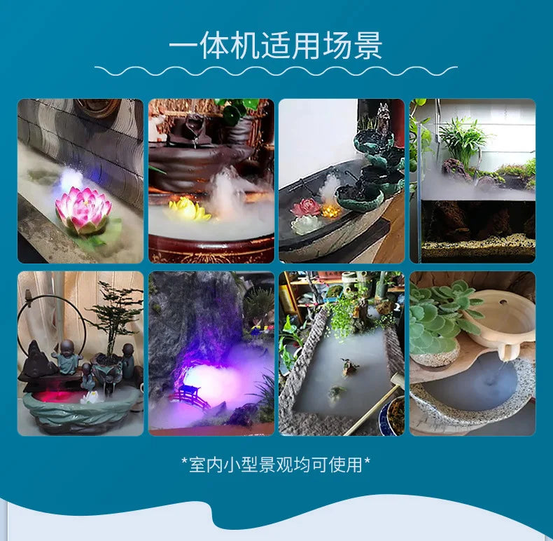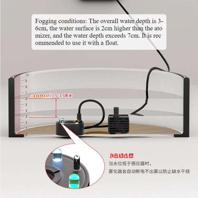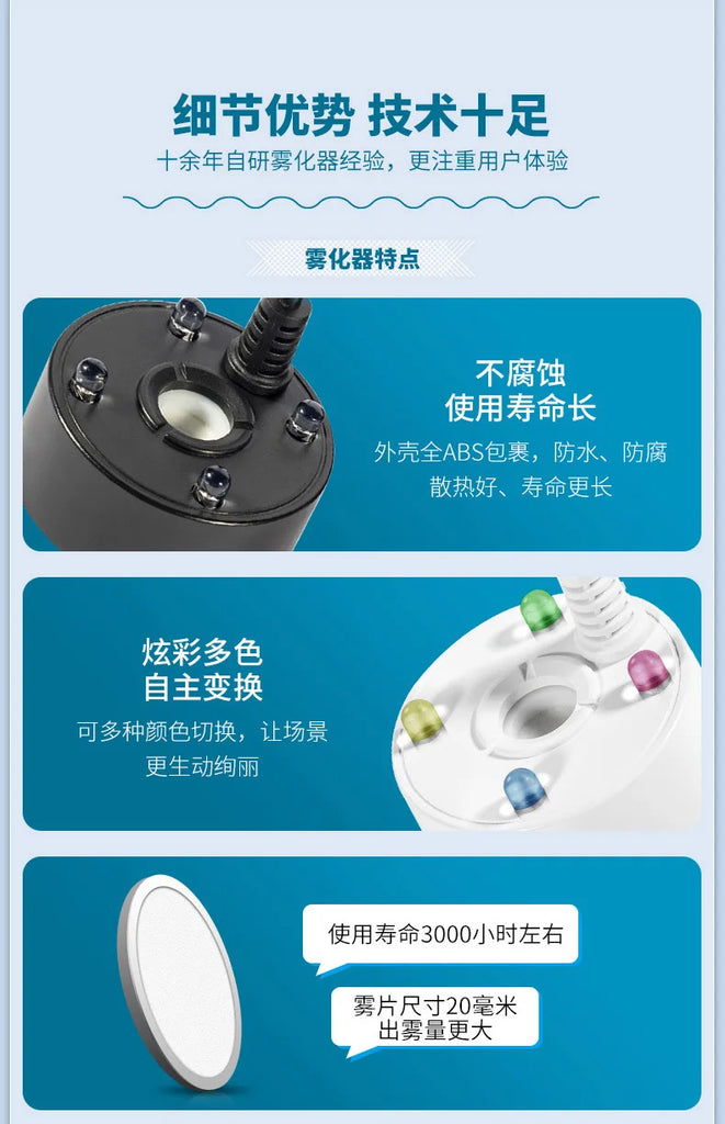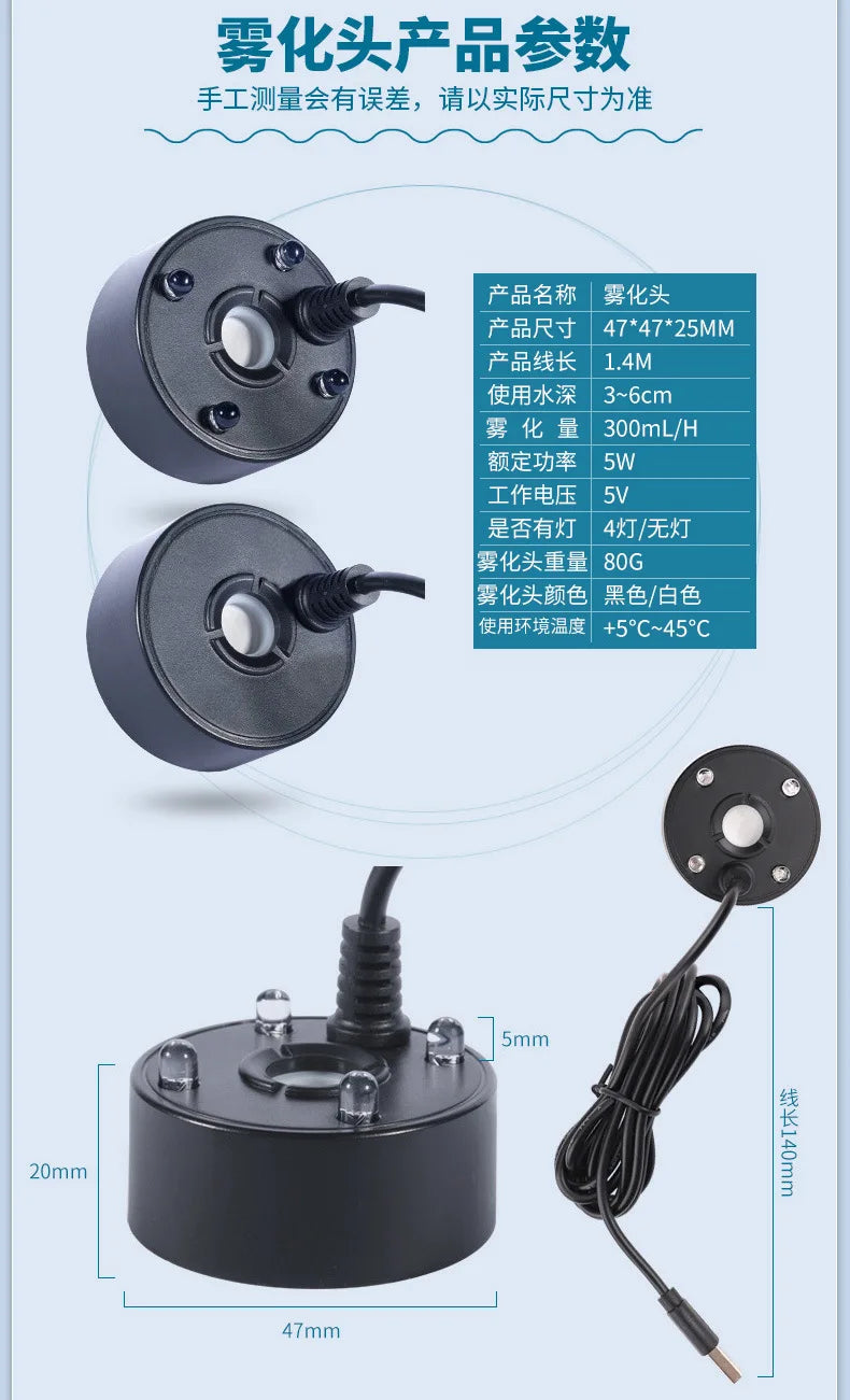 Setting up is a breeze—simply submerge the unit in water and connect it to a 5V power source. Enjoy a mesmerizing mist experience without the need for heat or chemicals. Prioritize safety with its built-in water shortage protection, while its quiet operation and energy efficiency offer peace of mind.