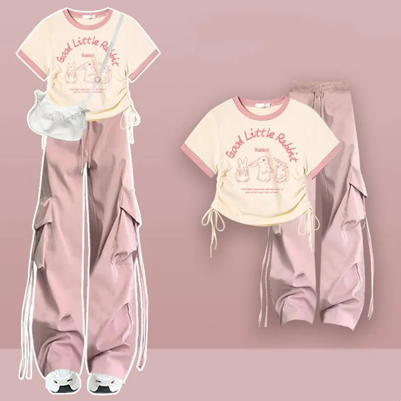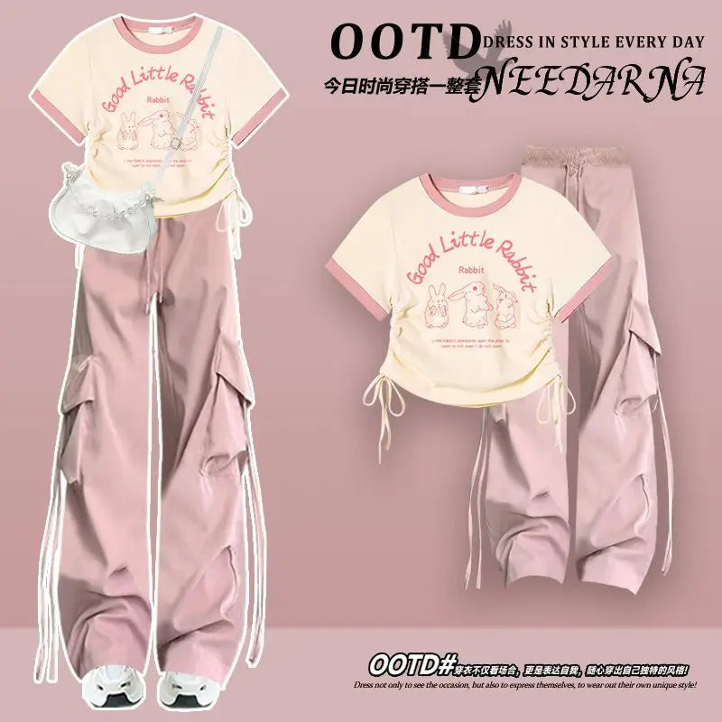 • 2024 Women's Spring/Summer Set: Short Sleeve Top + Pink Wide Leg Pants