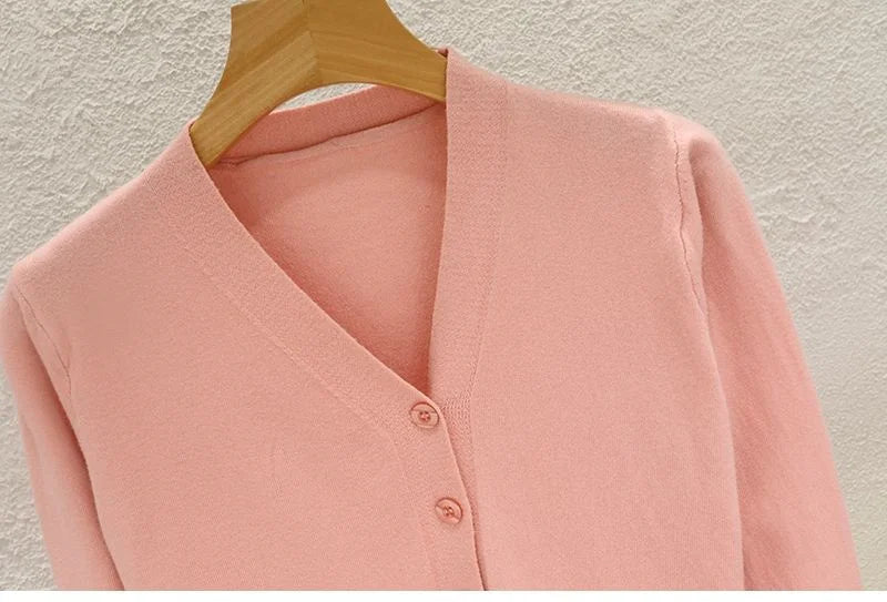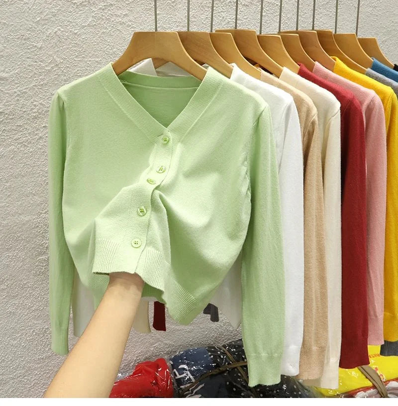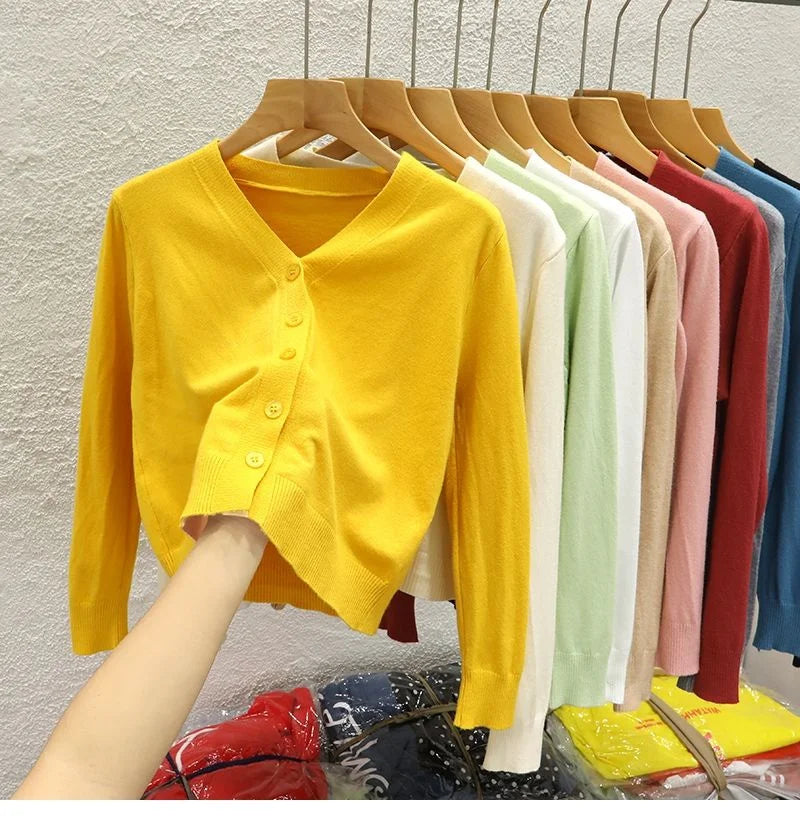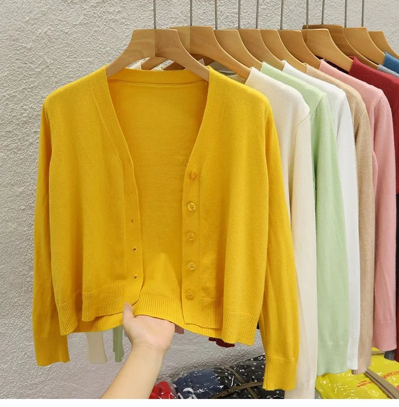 2024 Women's V-Neck Yellow Knit Cardigan, Spring/Autumn Green Outerwear