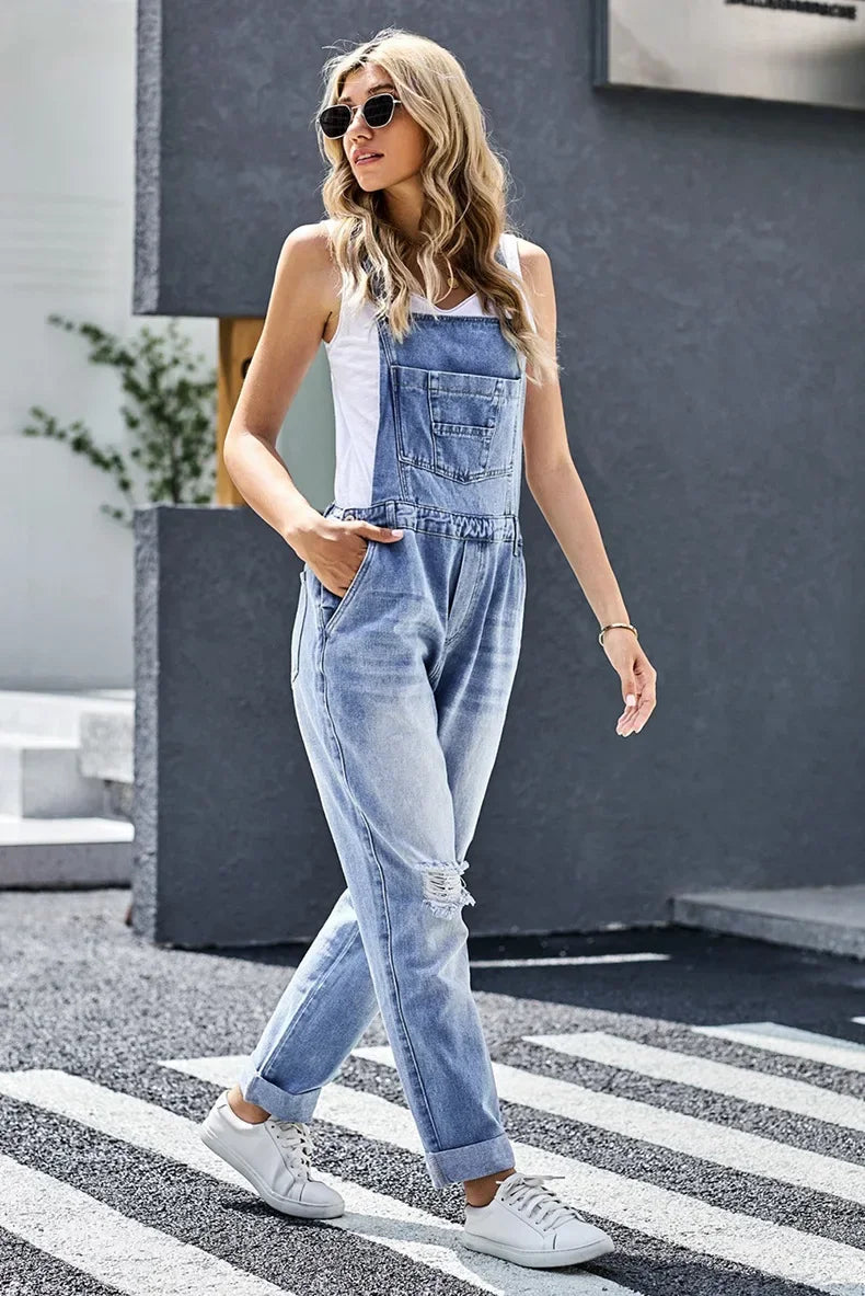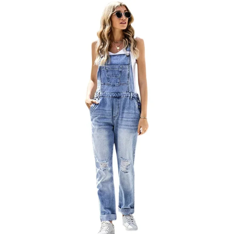 2024 Summer Women's Distressed Washed Slim Fit Jumpsuit Strap Pants