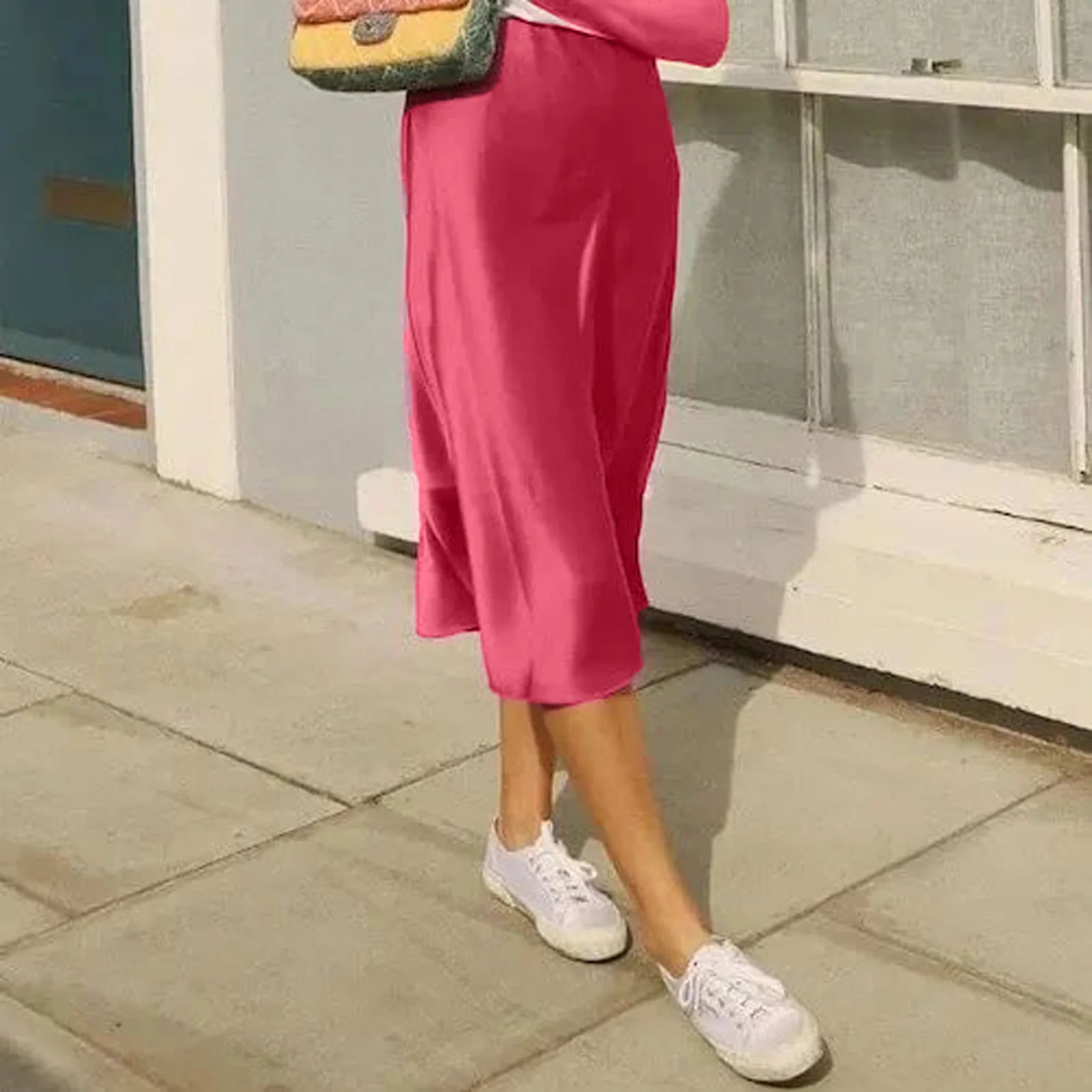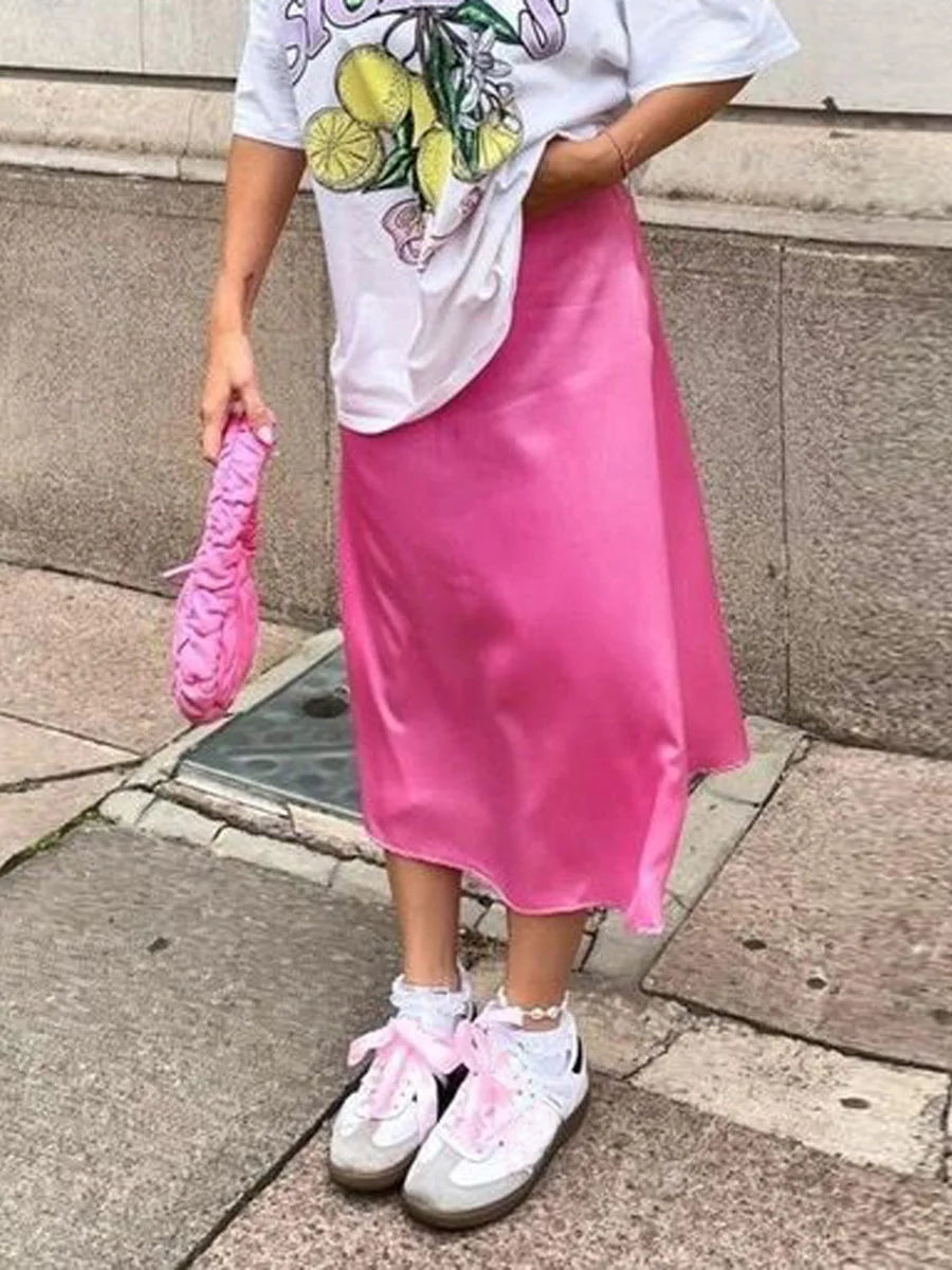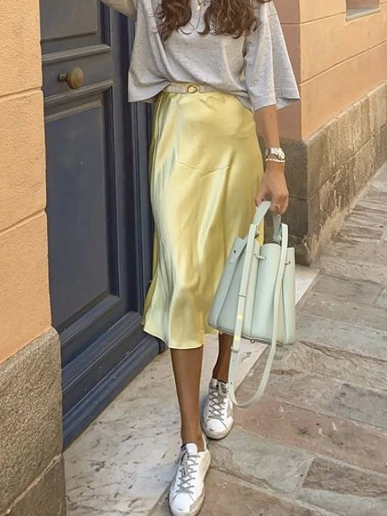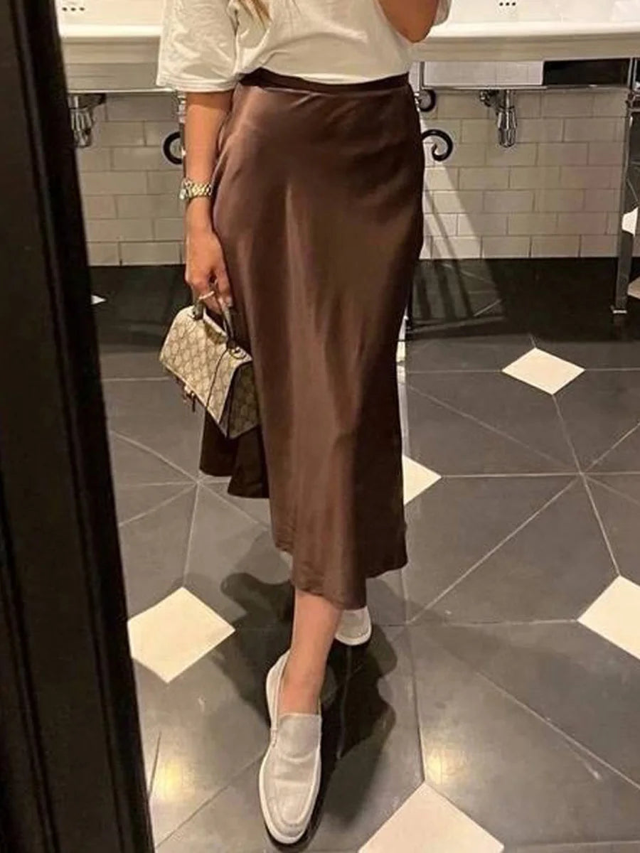 2024 Women's Summer Satin Midi Skirt, High Waist, Elegant Chic Office Wear, Korean Fashion Long Skirt