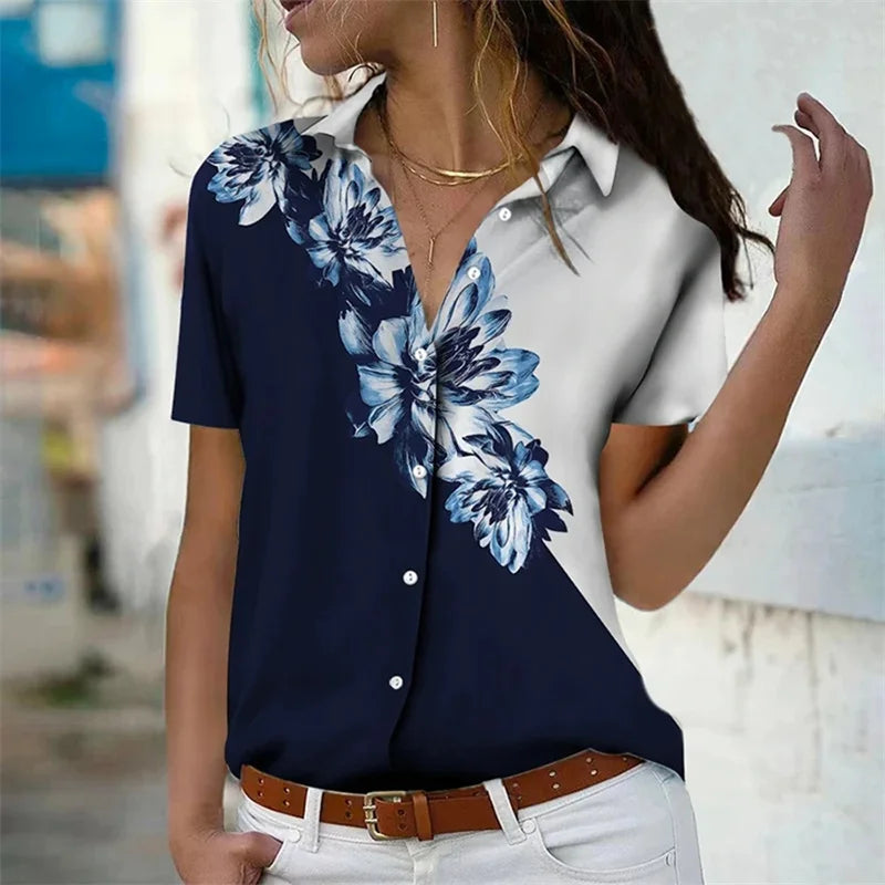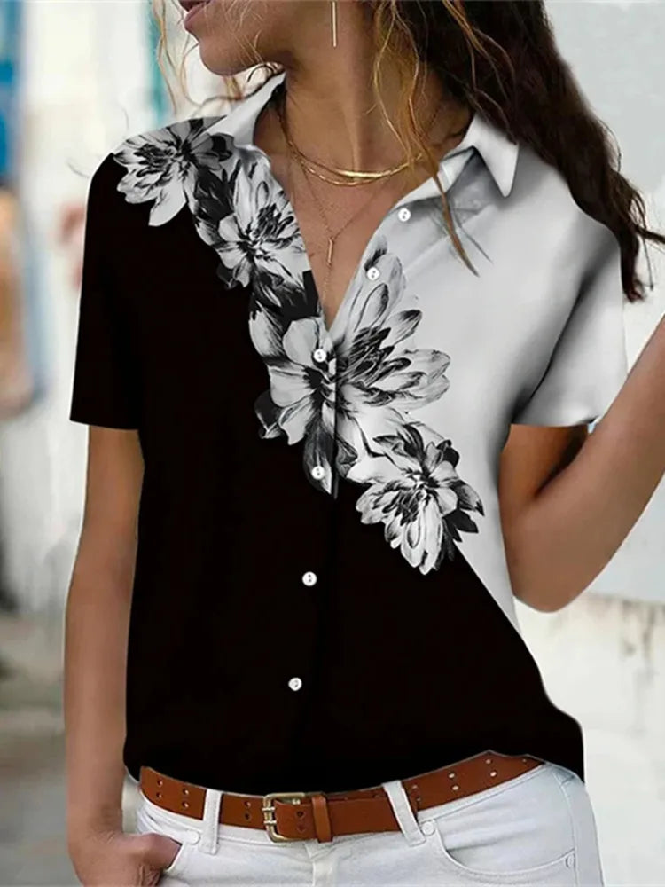 2024 Women's Floral 3D Print Y2K Streetwear Black Elegant Short Sleeve Blouse Button Top Office Collar Shirt
