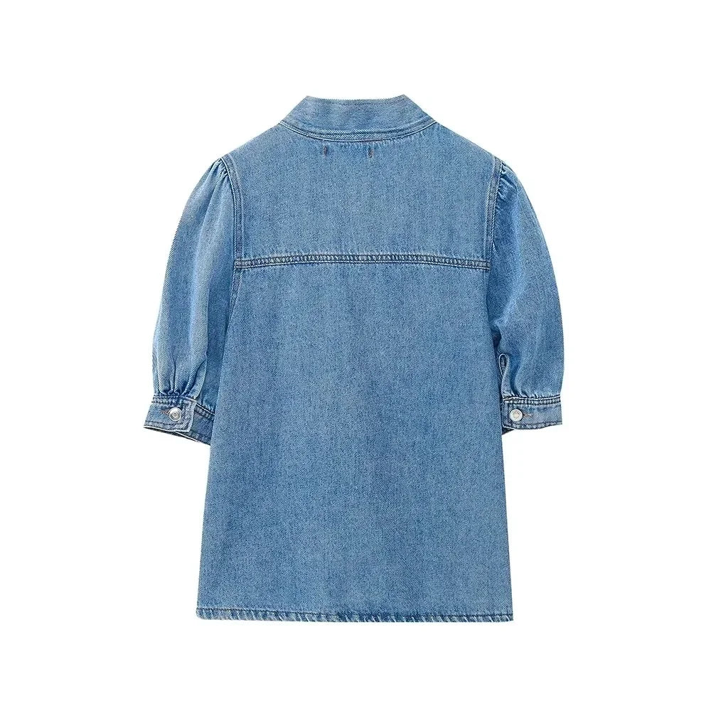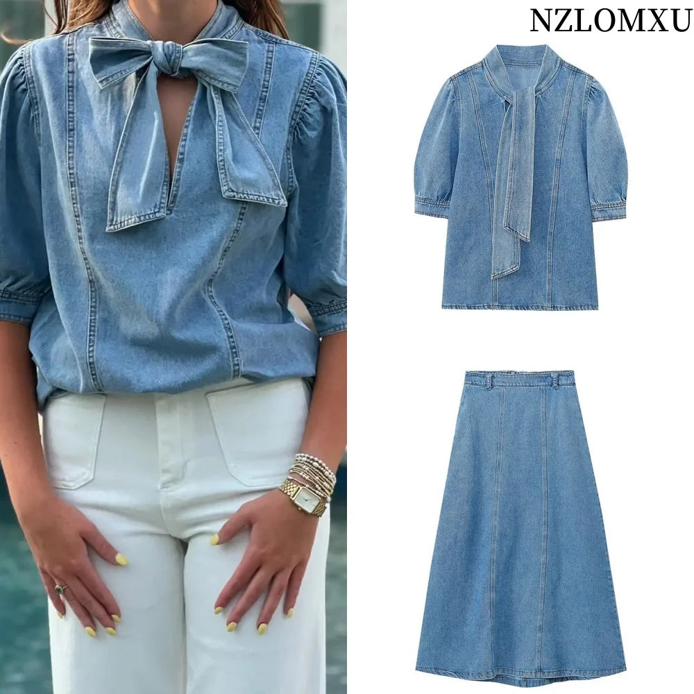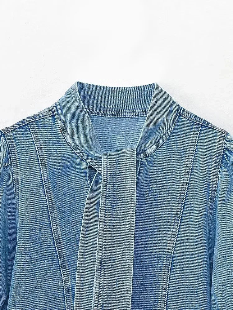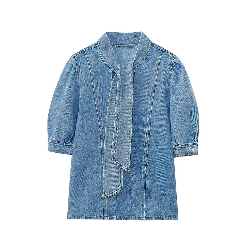 2025 Women's Fashion Bowtie Denim Shirt - Casual Loose Blouse with Long Sleeves