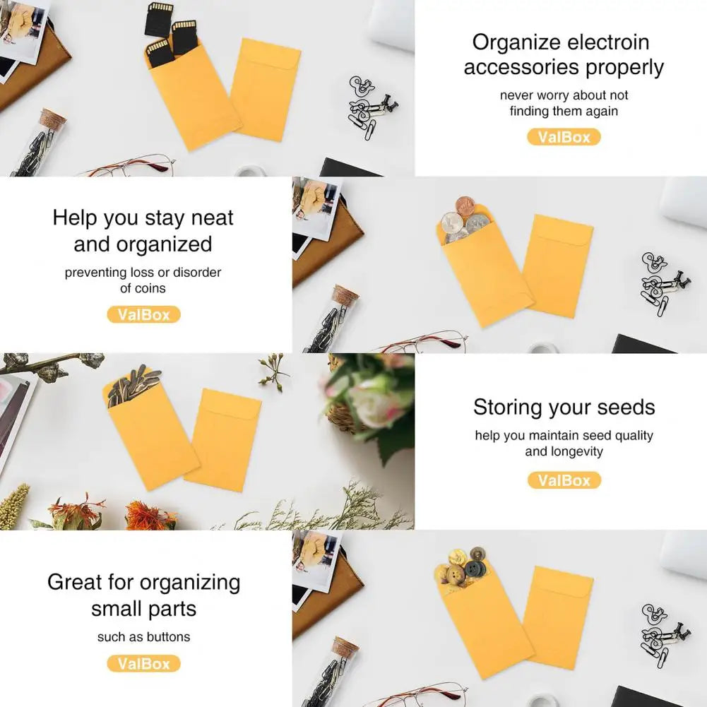 Introducing our versatile and eco-friendly cash envelope set, perfect for organizing and securing your small valuables. These 50 self-adhesive envelopes are crafted from high-quality recycled kraft paper, offering a durable and textured surface that resists fading. Ideal for storing coins, cash, seeds, stamps, jewelry, pins, keys, screws, and more, these envelopes are essential for both personal and professional settings. Keep your items safe and organized with this convenient storage solution.