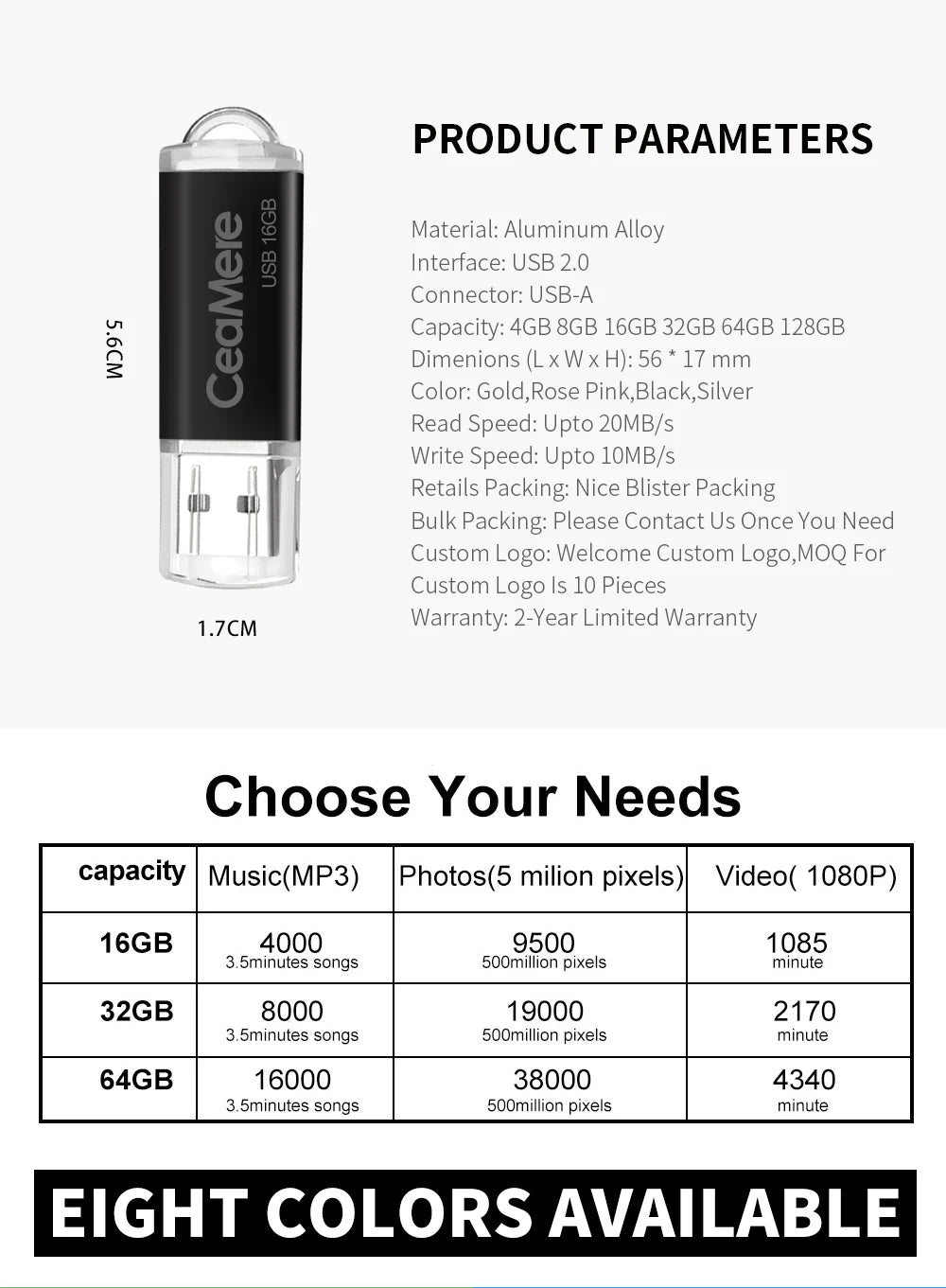 Available in a variety of colors including white, black, green, blue, red, purple, and yellow, this lightweight 20g drive offers a range of capacities from 1GB to 128GB. Its compatibility spans multiple operating systems, including Windows (from Win 98 to Win 10) and Mac OS (OS 9.x and above), as well as LINUX 2.4 and above.