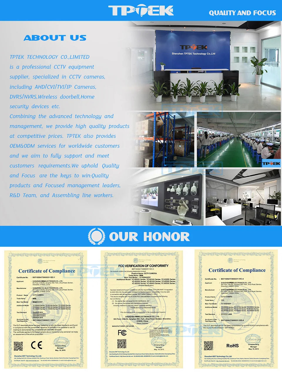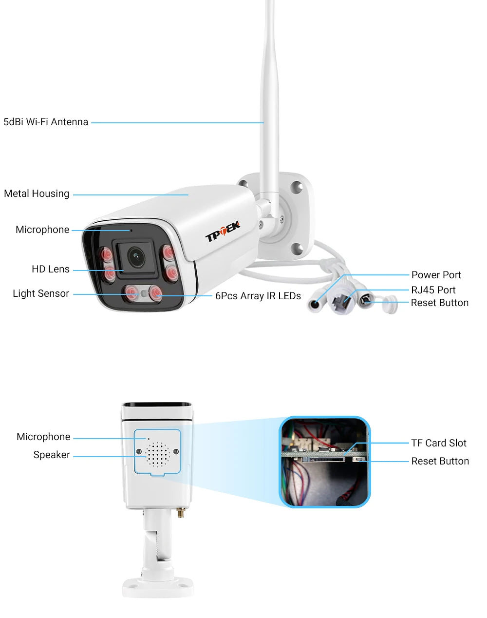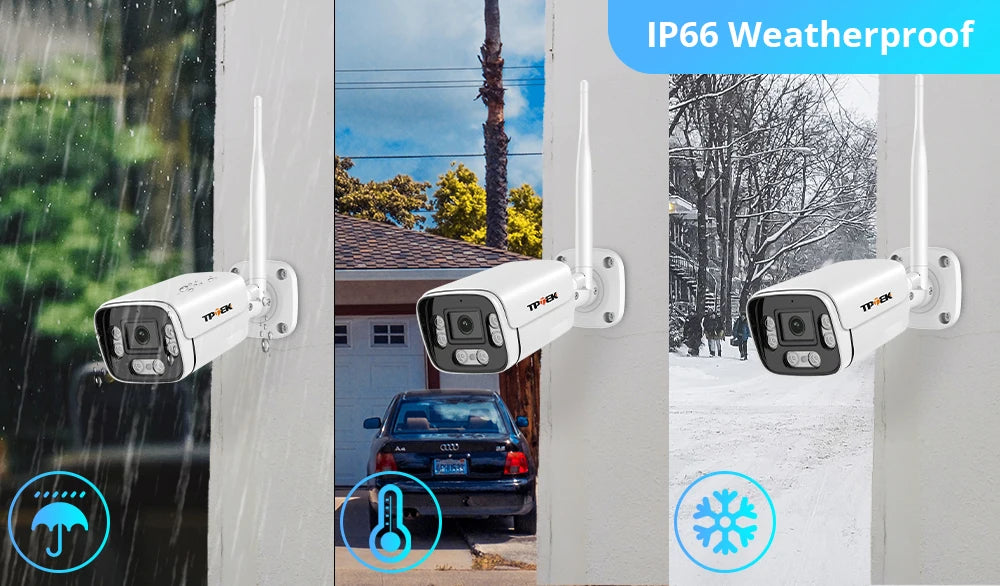 Engineered for outdoor use, the TPTEK camera boasts a robust metal casing with an IP66 weatherproof rating, ensuring performance in rain, snow, harsh temperatures, and heat. Its 30-meter night vision, powered by 6 Array IR LEDs, guarantees round-the-clock coverage.