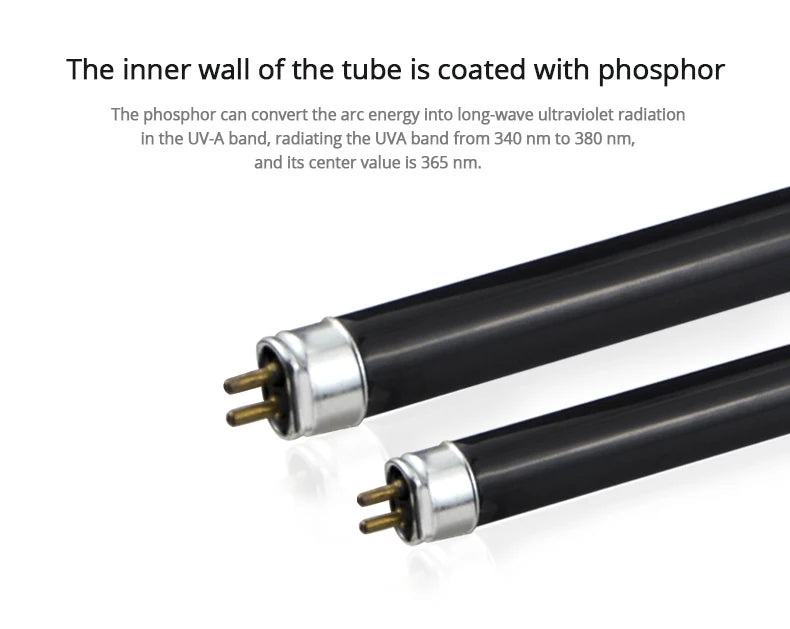 Elevate your inspection capabilities with our high-quality ultraviolet light tube. Expertly crafted from blue-black glass with a phosphor-coated inner wall, this UV lamp emits light exclusively in the 320-400 nm wavelength range, with a central peak at 365 nm. This unique emission enables the fluorescence effect, converting invisible ultraviolet light into visible light suitable for various fluorescence analysis applications.