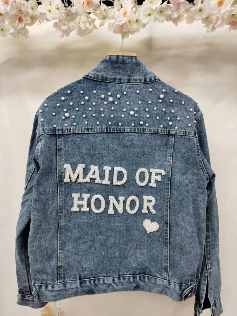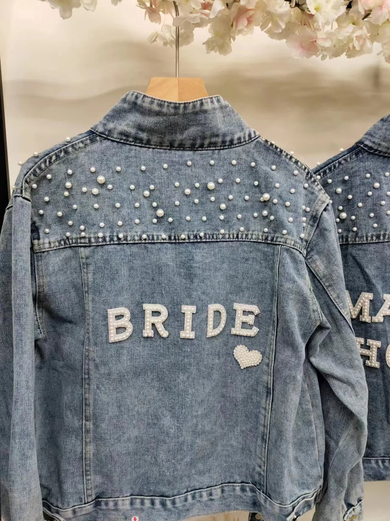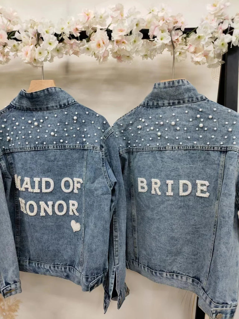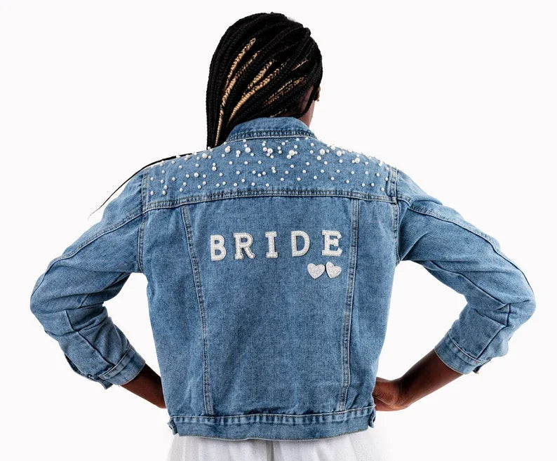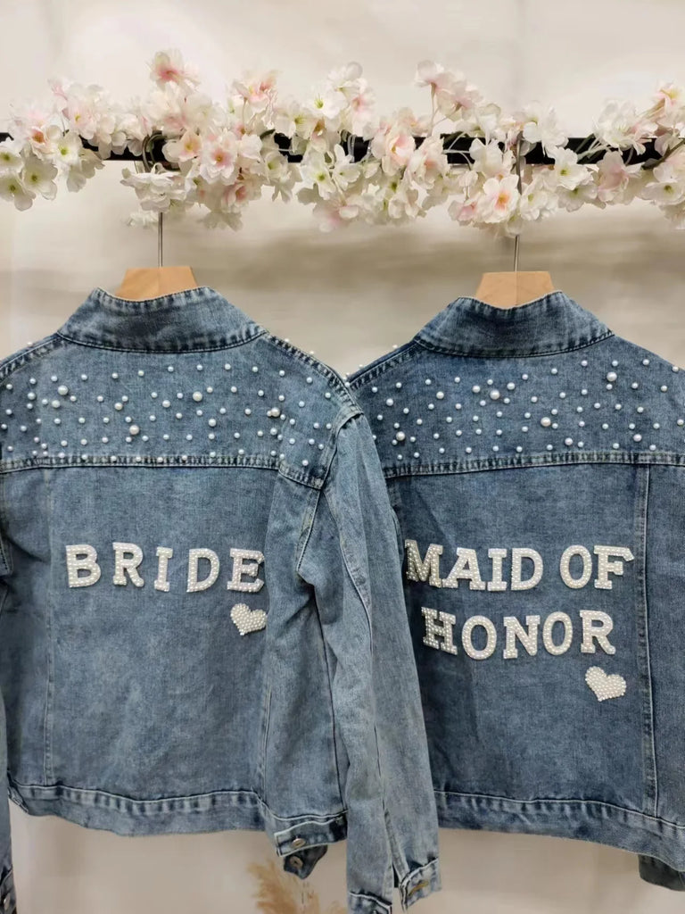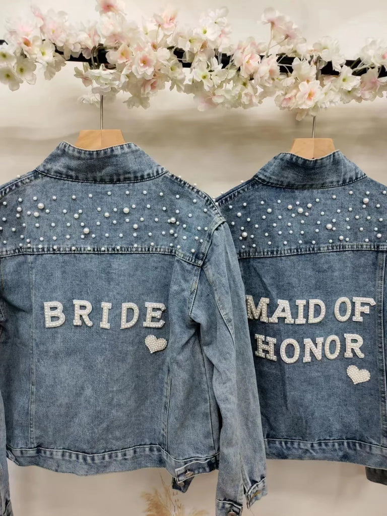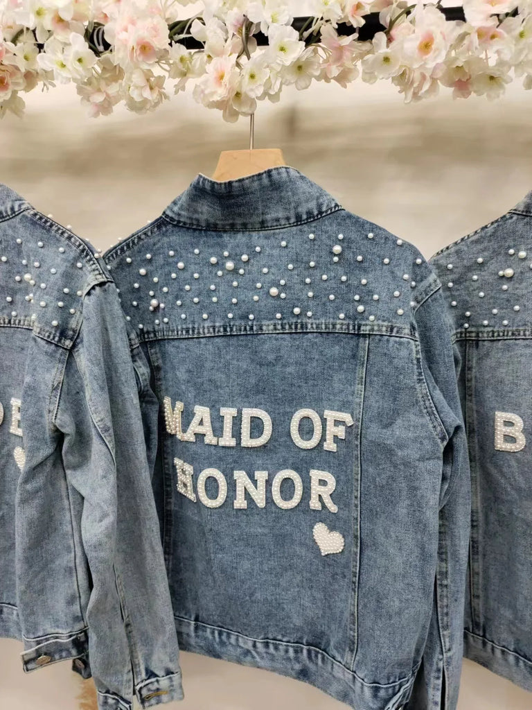 Elevate your style with this chic denim jacket, perfect for a variety of occasions like bridal showers, birthday parties, and more. Made from a blend of polyester and cotton, this jacket features a unique printed pattern and eye-catching pearl decorations. Designed for comfort and style, it boasts a turn-down collar, a single-breasted closure, and full sleeves. Ideal for autumn and winter, this jacket offers a casual, loose fit that complements any wardrobe. Personalize your jacket with custom text on the collar or back using heat press white glitter to make it uniquely yours.