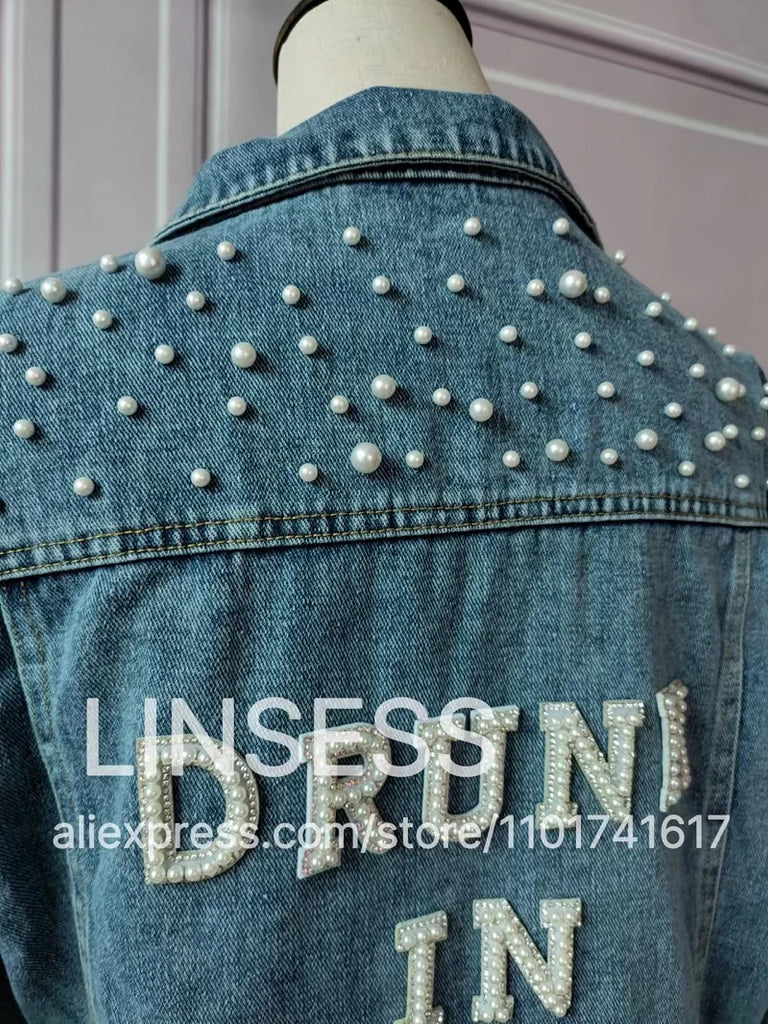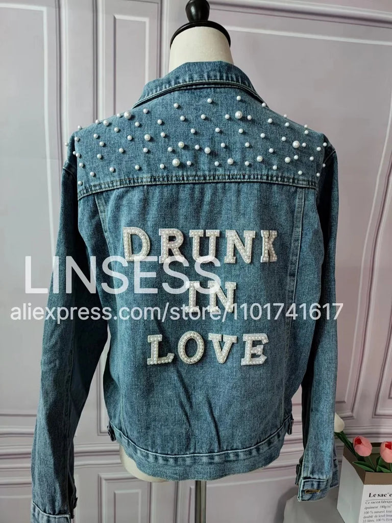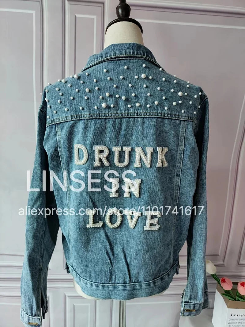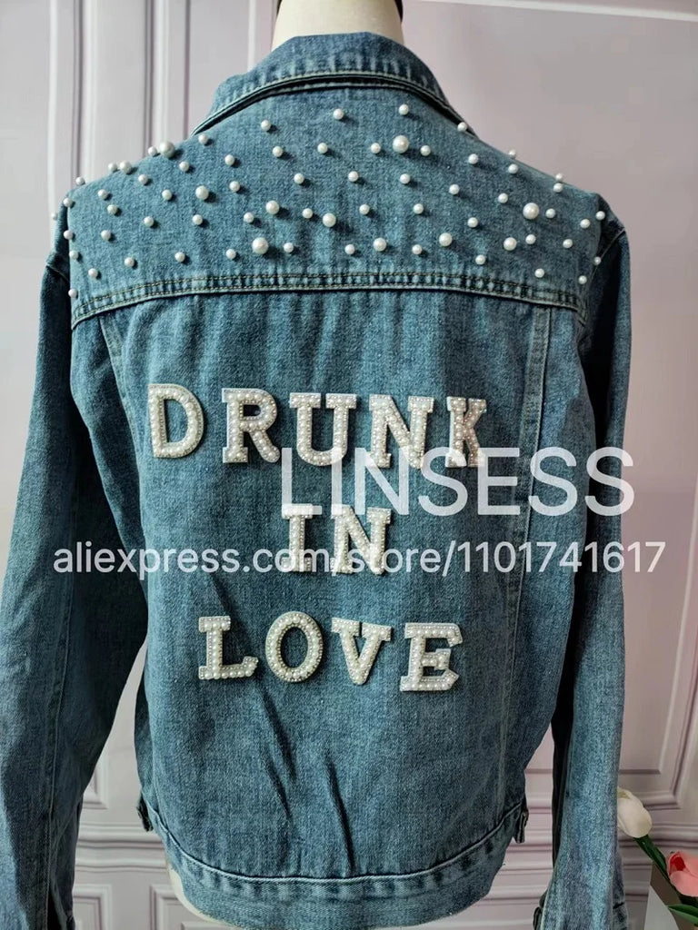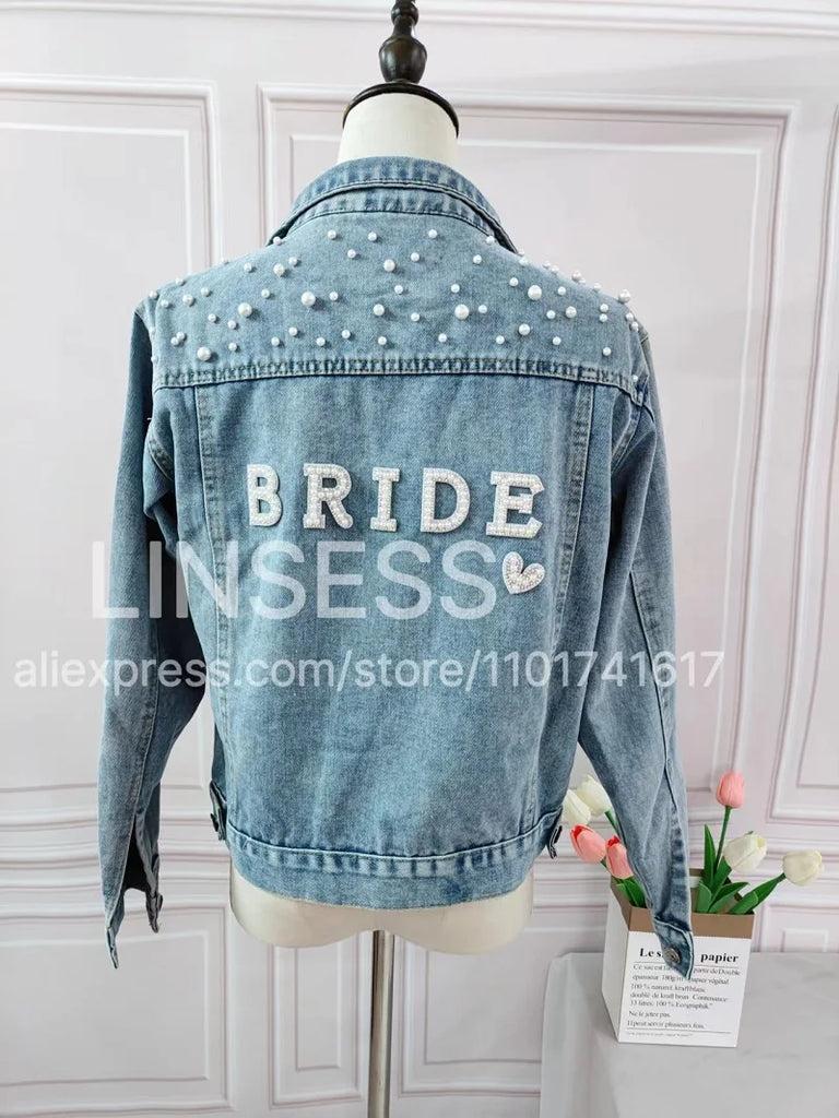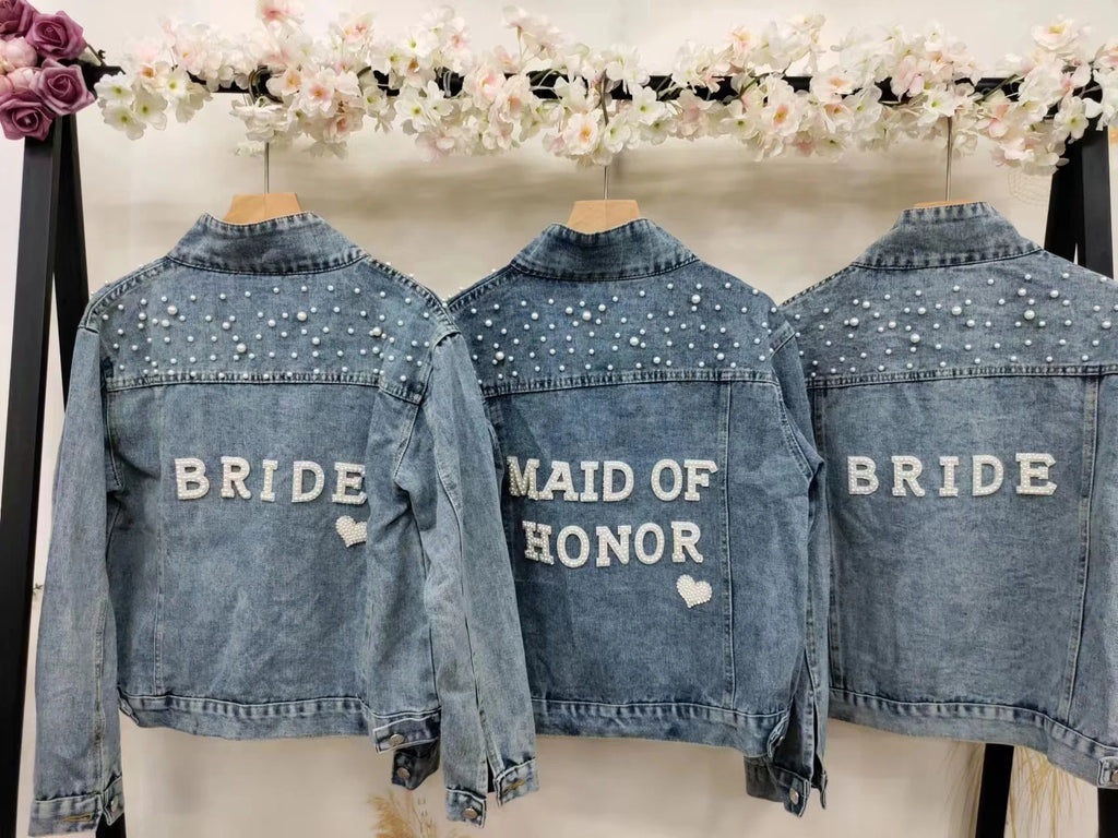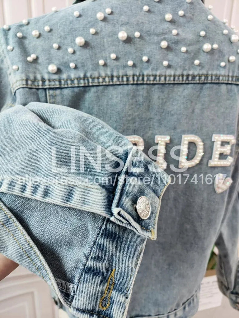 Elevate your style with this chic denim jacket, perfect for a variety of occasions like bridal showers, birthday parties, and more. Made from a blend of polyester and cotton, this jacket features a unique printed pattern and eye-catching pearl decorations. Designed for comfort and style, it boasts a turn-down collar, a single-breasted closure, and full sleeves. Ideal for autumn and winter, this jacket offers a casual, loose fit that complements any wardrobe. Personalize your jacket with custom text on the collar or back using heat press white glitter to make it uniquely yours.