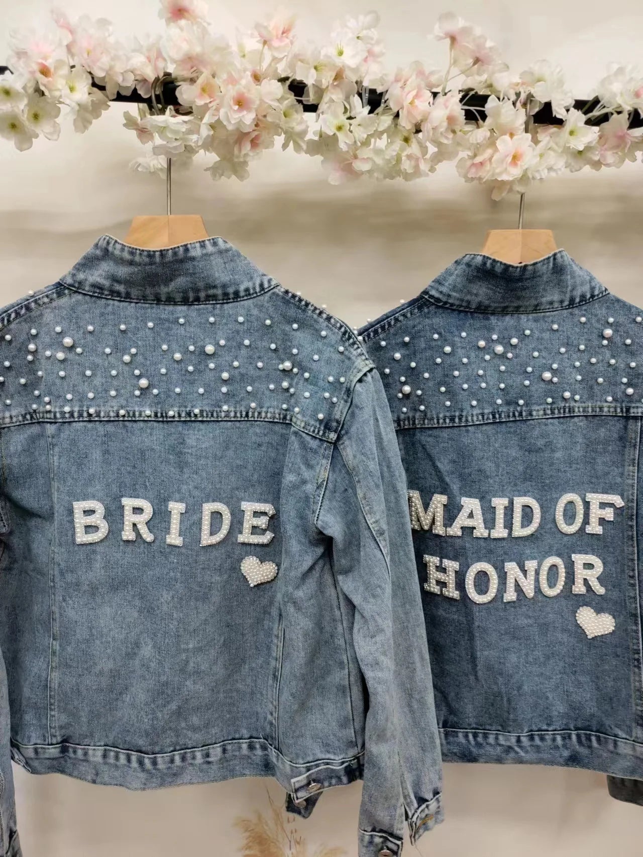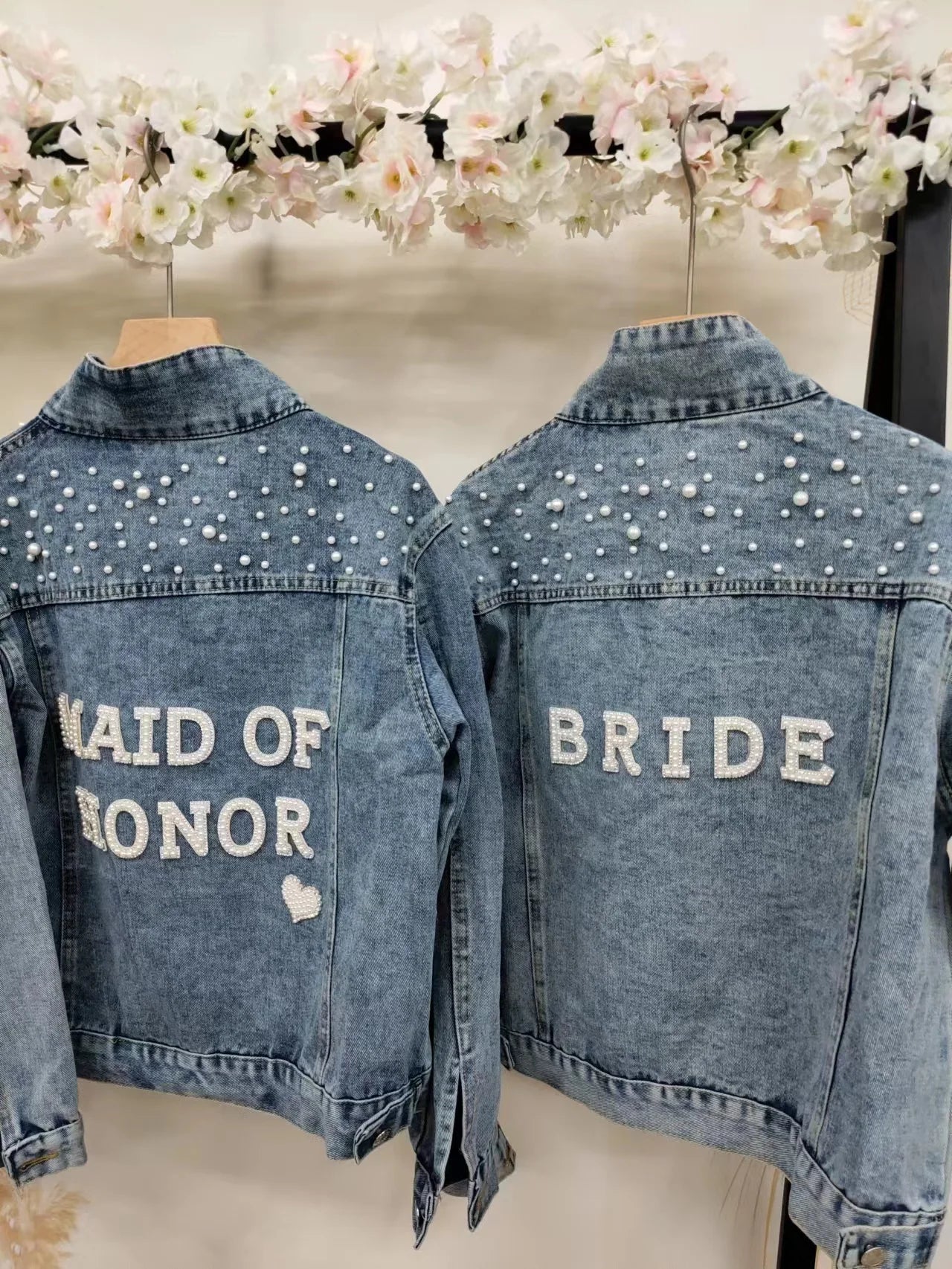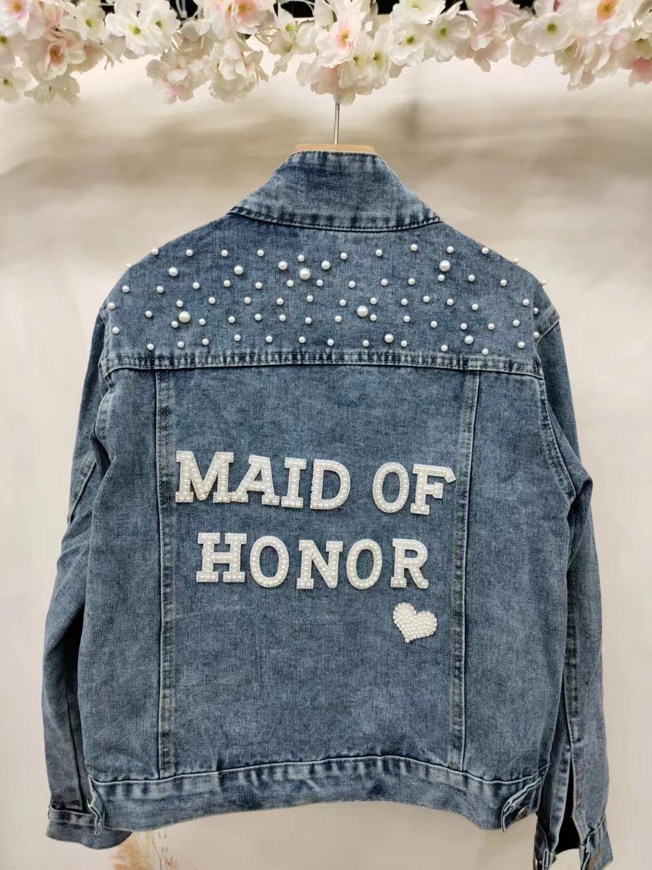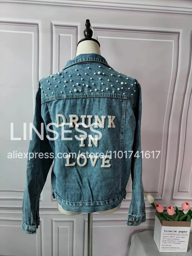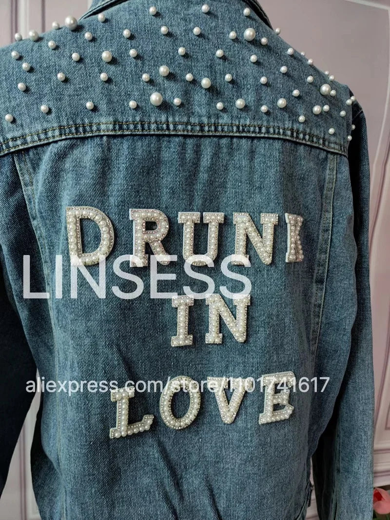 Elevate your style with this chic denim jacket, perfect for a variety of occasions like bridal showers, birthday parties, and more. Made from a blend of polyester and cotton, this jacket features a unique printed pattern and eye-catching pearl decorations. Designed for comfort and style, it boasts a turn-down collar, a single-breasted closure, and full sleeves. Ideal for autumn and winter, this jacket offers a casual, loose fit that complements any wardrobe. Personalize your jacket with custom text on the collar or back using heat press white glitter to make it uniquely yours.