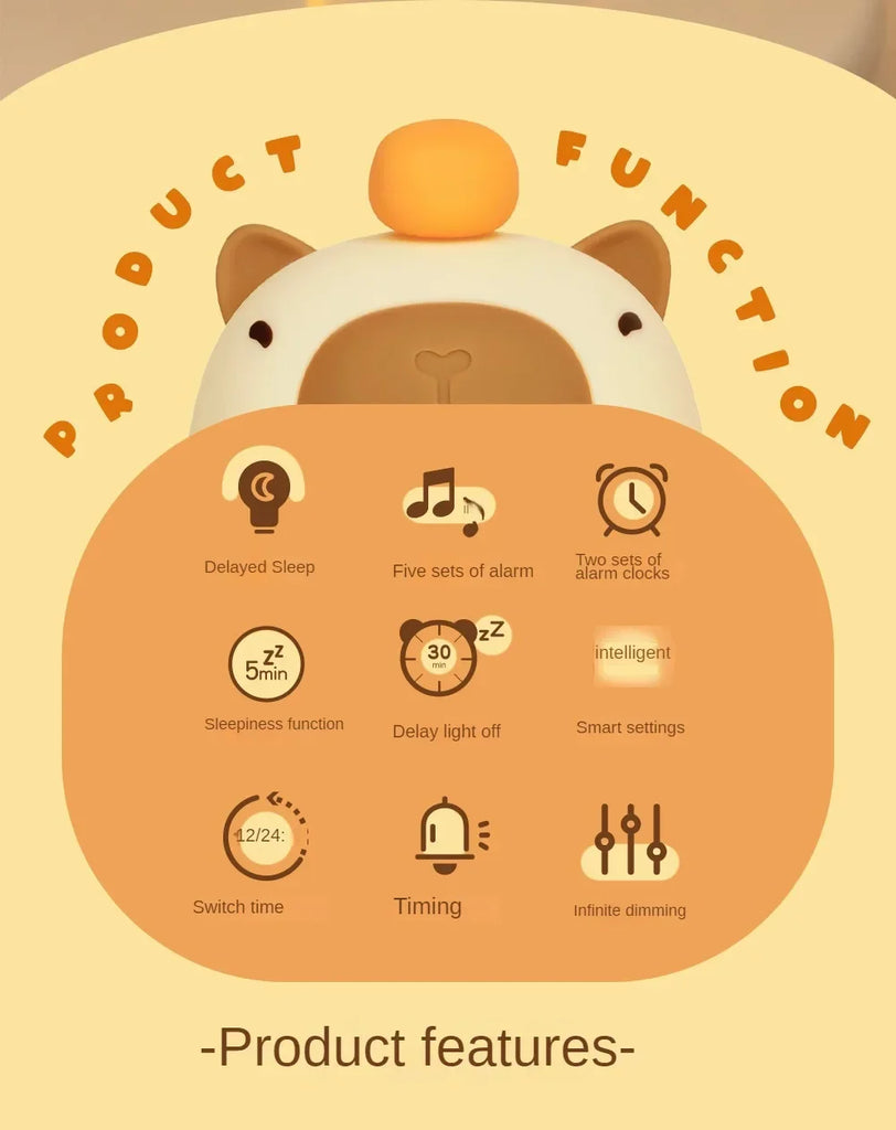 The Capybara Alarm Clock Night Light combines charming design with functionality, perfect for both children and adults. Crafted from durable ABS, HIPS, and silicone, its adorable capybara shape adds a whimsical touch to any room. This novelty light emits a soft, warm glow, creating a soothing atmosphere ideal for bedrooms and nurseries. The built-in digital clock features dual alarm settings and a snooze function to make waking up easier. With its rechargeable 1200mAh battery, this portable light offers convenience for on-the-go use, ensuring a comforting presence wherever needed.