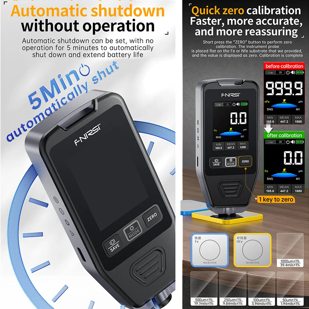 Equipped with an ultra-clear, high-definition inverse display, you'll enjoy easy readability day or night. With dual measurement modes, you can obtain results in seconds with convenient, direct measurements. The gauge supports multiple metal types—iron, lead, and zinc—making it versatile and comprehensive for various applications.