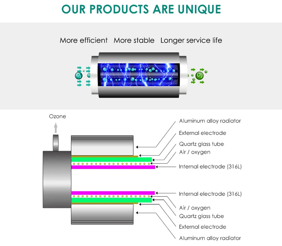- High Efficiency: Utilizes narrow-gap discharge technology with a high ozone conversion rate and minimal noise.