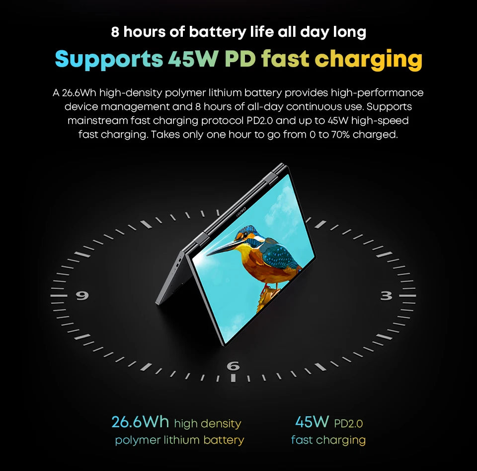 - Battery Life: Up to 8 hours, 45W PD fast charging
