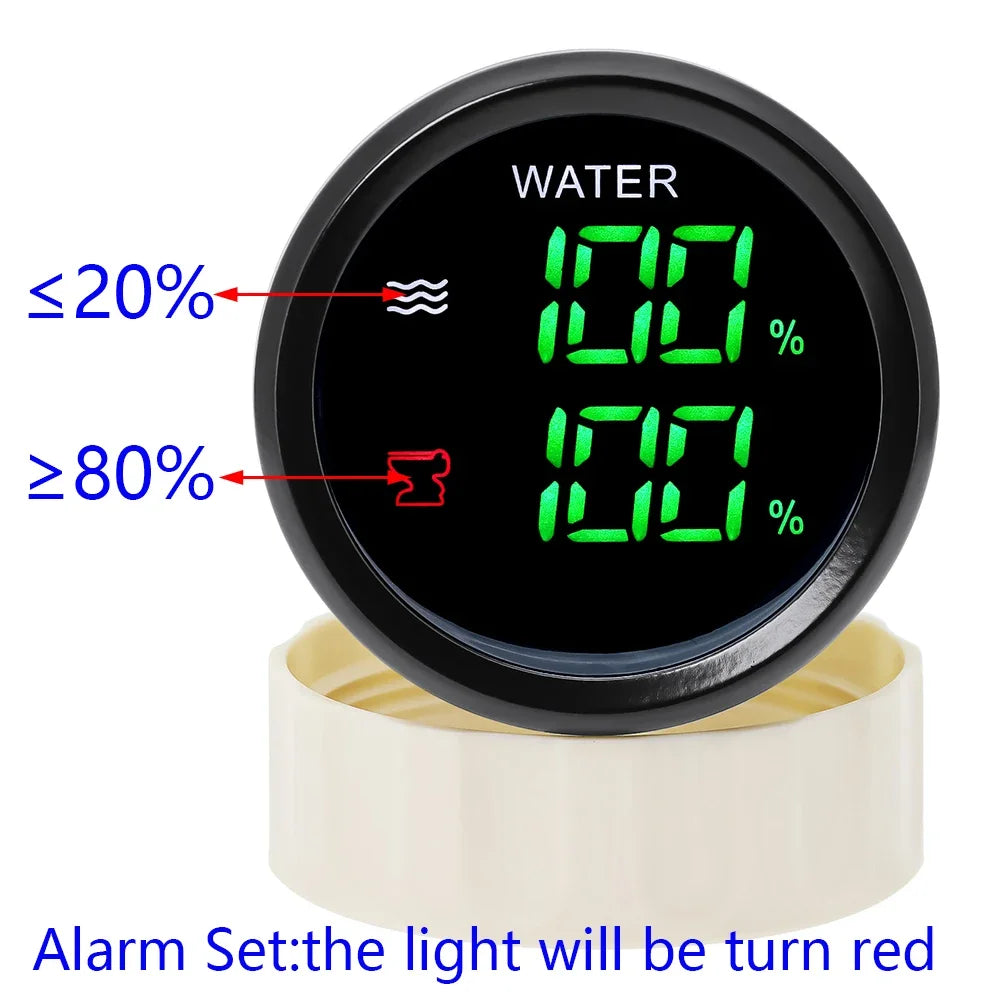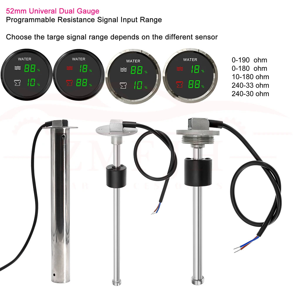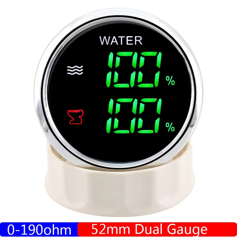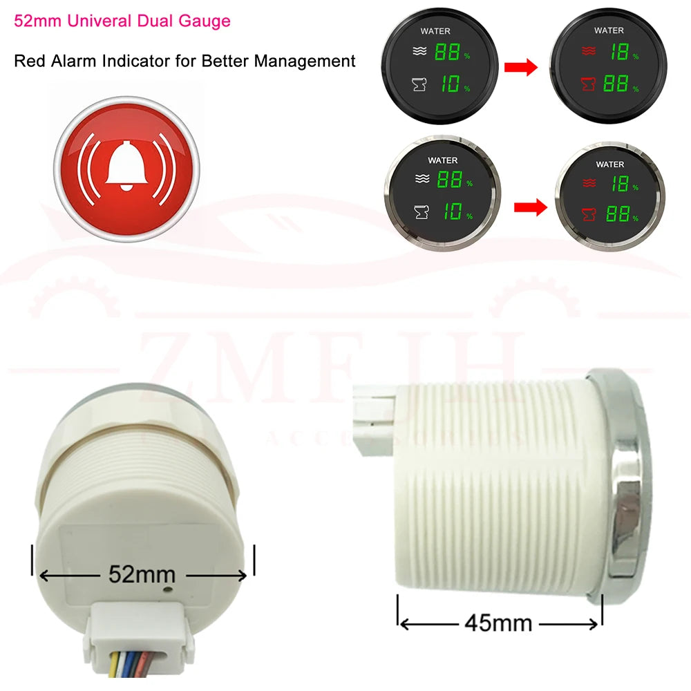 52mm Digital Dual Gauge 0-190ohm Water/Sewage Level Meter with Alarm for Boat Car 12V/24V
