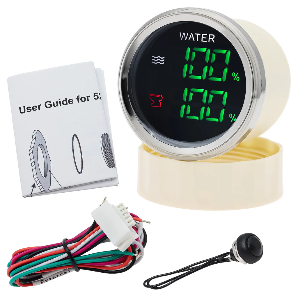 Enhance your marine, truck, or motor home experience with this versatile 2 52mm Dual Water and Sewage Level Gauge. Designed for both efficiency and ease of use, this dual gauge offers reliable monitoring of both water and sewage levels. The device features a high-resolution display, ensuring easy readability even under direct sunlight. The gauge is engineered to adapt to various sensors, with programmable input resistance to suit different needs. It boasts reverse polarity protection and anti-fogging performance, making it a durable choice for various applications.