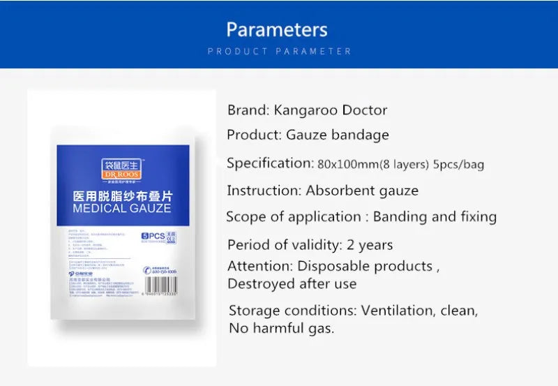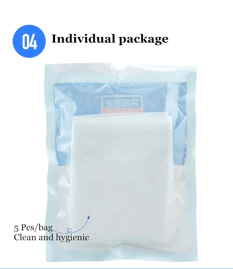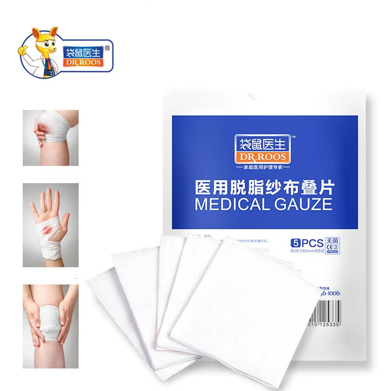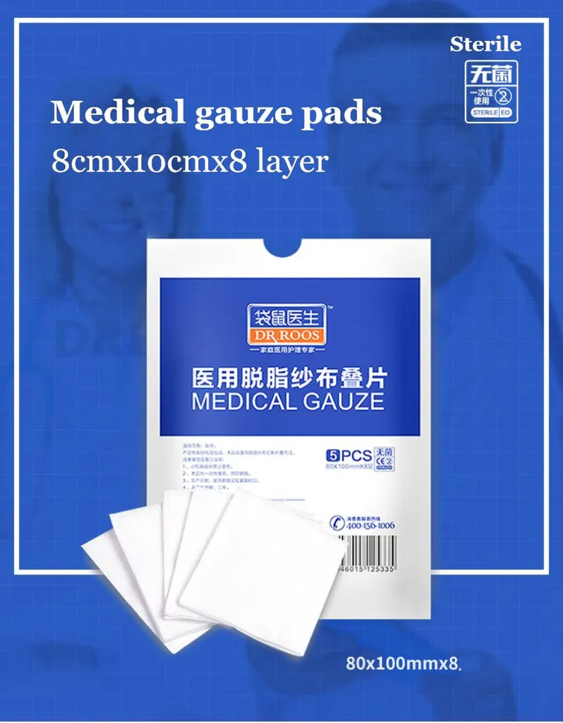 Introducing the DR.ROOS Medical Absorbent Gauze Pads, designed for optimal wound care. Each pad measures 80x100mm and is crafted from 100% cotton, featuring eight layers of soft, highly absorbent material. These sterile gauze pads are ideal for first aid and wound dressing, ensuring maximum protection and comfort. Secure yours now in a convenient pack of 5 pieces per bag for reliable medical supplies on hand.