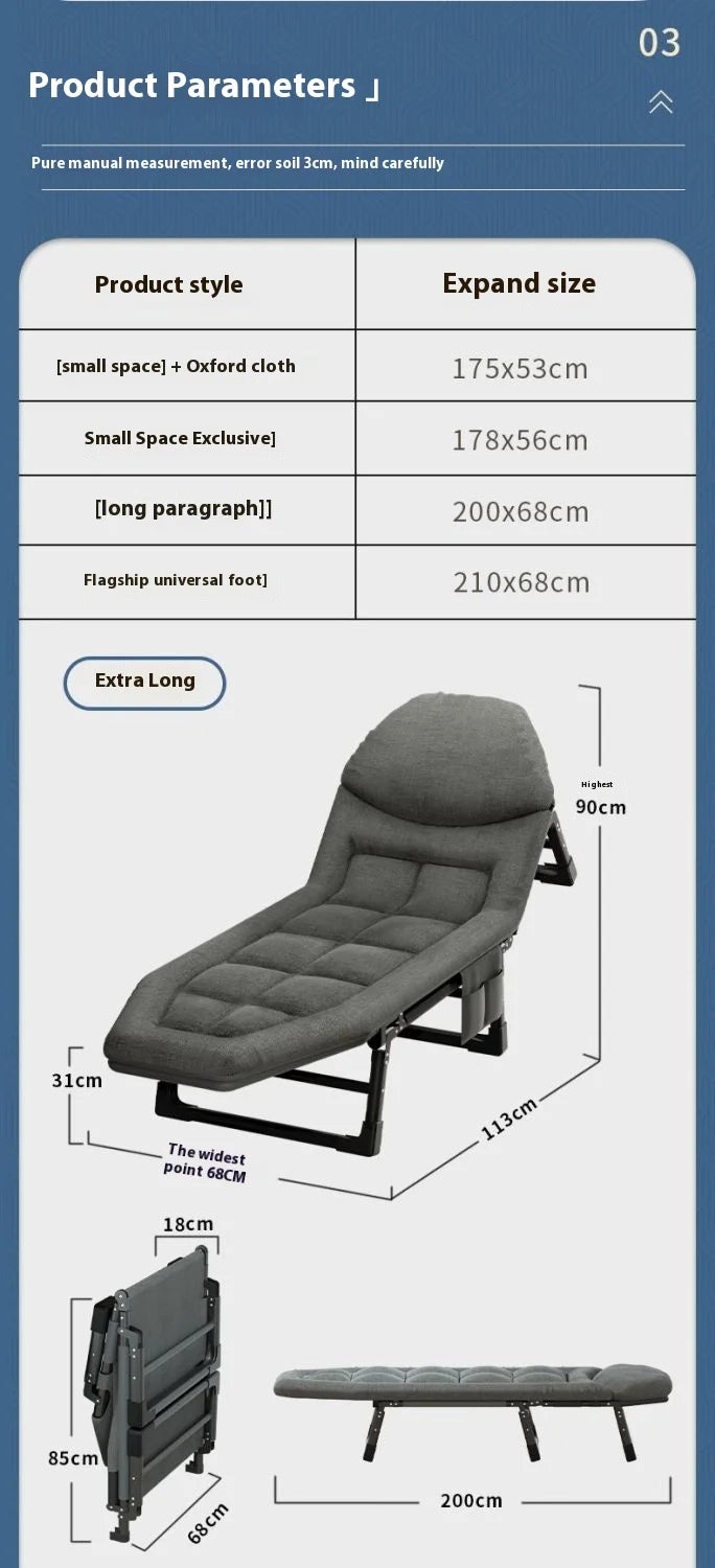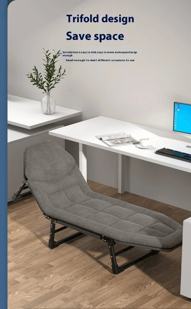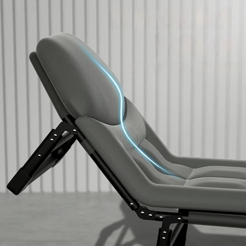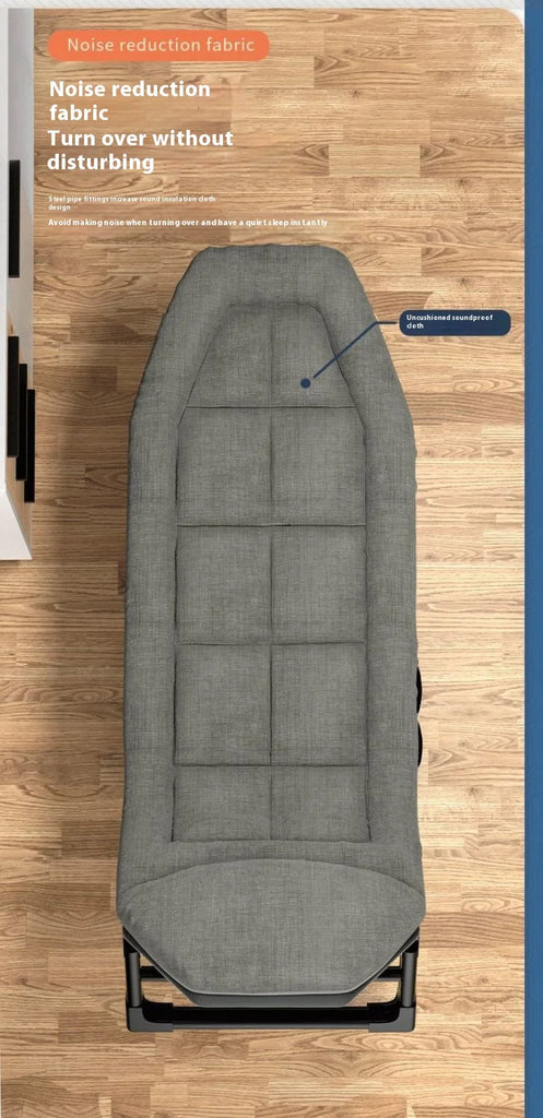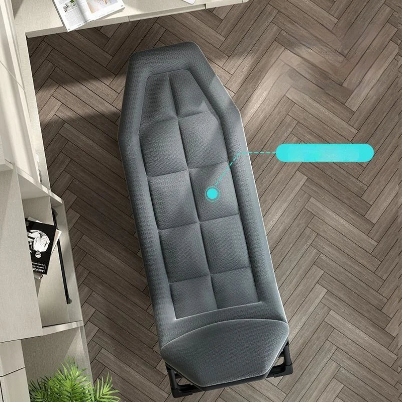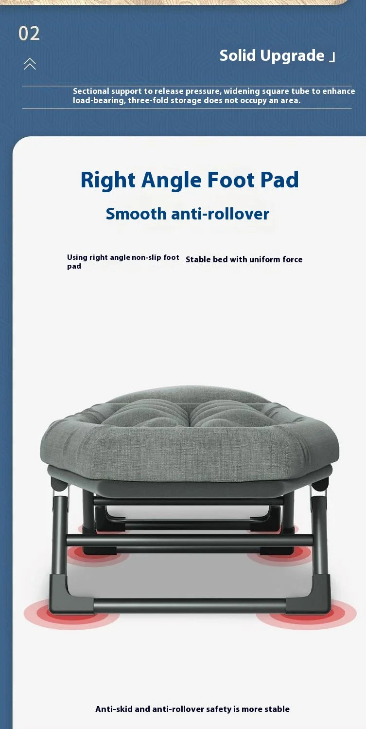 The chaise lounge features a simple three-fold design, allowing it to be stored effortlessly in just 10 seconds. Its right-angle, non-slip foot pads stabilize the bed, ensuring even distribution of weight. Additionally, the noise-cancelling fabric and soundproof cloth design in the steel pipe parts minimize disturbances, providing a serene sleeping experience.