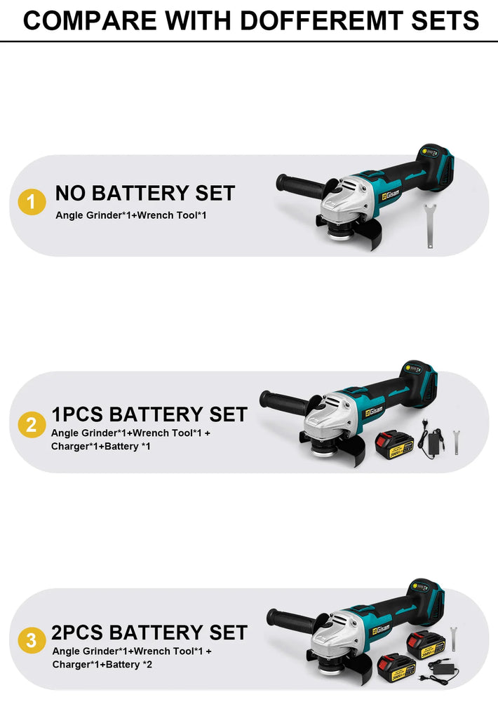 - 2 Battery: Angle Grinder, 2 Batteries, Power Adapter, Wrench Tool, User Manual, Carton Box