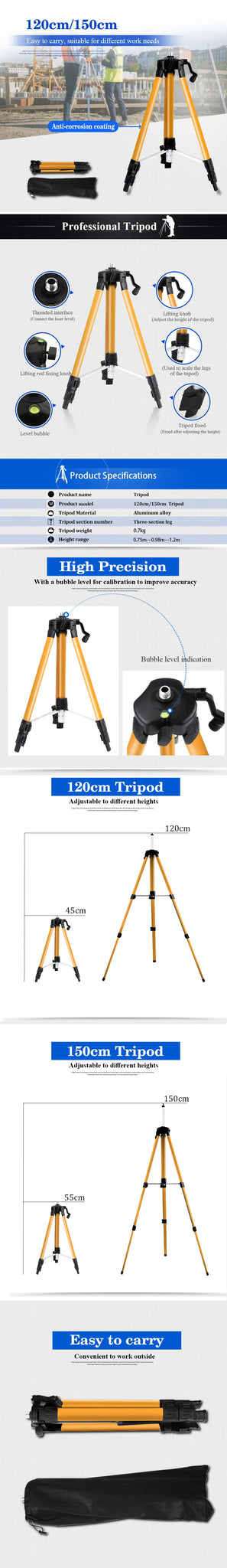 Adjustable 1.2/1.5m Laser Level Tripod with 5/8" Adapter, Metal Bracket, Anti-Corrosion Coating