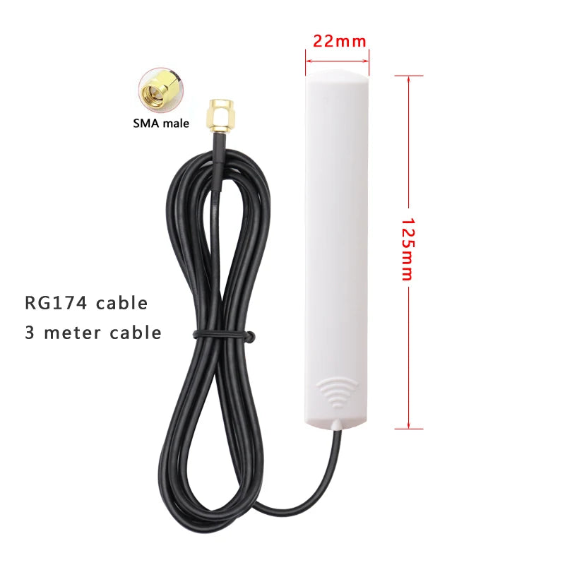 The antenna features a durable 3-meter RG174 cable, providing flexibility in positioning, and is equipped with an SMA Male connector for compatibility with a variety of devices. Designed with an impedance of 50Ω and a power handling capability of 50W, this antenna delivers reliable performance with an SWR of less than 1.5 for minimal signal loss.