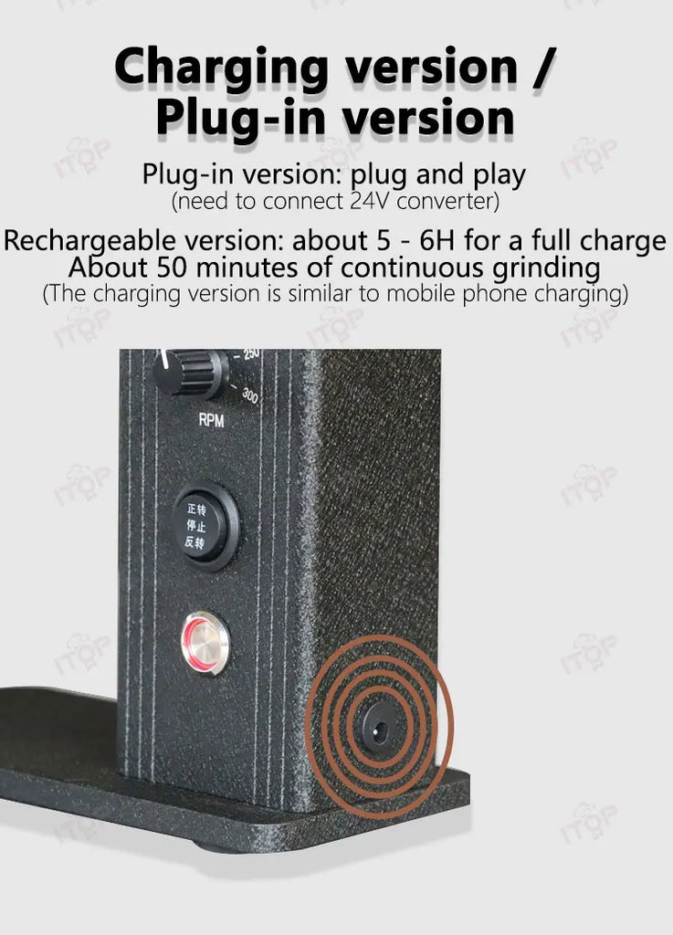 Choose between the charging or plug-in version based on your convenience. The charging model features a 3000mAh built-in lithium battery, allowing approximately 50 minutes of continuous grinding after a 5-6 hour full charge. Enjoy variable speed adjustments ranging from 50 to 300 RPM, tailored to your grinding needs. The unit is crafted from durable aluminum alloy and PV, ensuring longevity and performance.