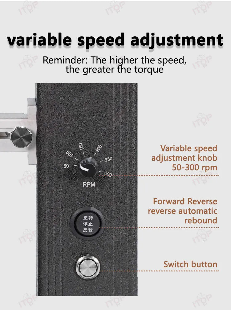 - Variable Speed: 50-300 RPM adjustments, higher speeds increase torque.