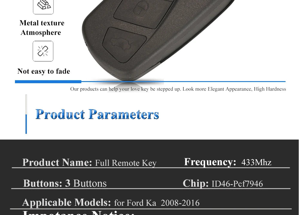 Upgrade your vehicle's key fob with this top-quality auto key replacement. Crafted from durable ABS and metal materials, this key fob shell is designed specifically for Ford KA models from 2008 to 2016. It features a 433.92MHz frequency and is compatible with a transponder chip NXP Hitag 2 PCF7946 ID46, ensuring seamless functionality. This aftermarket part guarantees a perfect fit and effortless integration with your existing system.