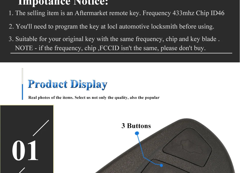 Important: Before purchasing, confirm that your current key shares the same chip and frequency. This remote key includes an SIP22 blade and is suitable for car keys with a matching transmitter and chip frequency.