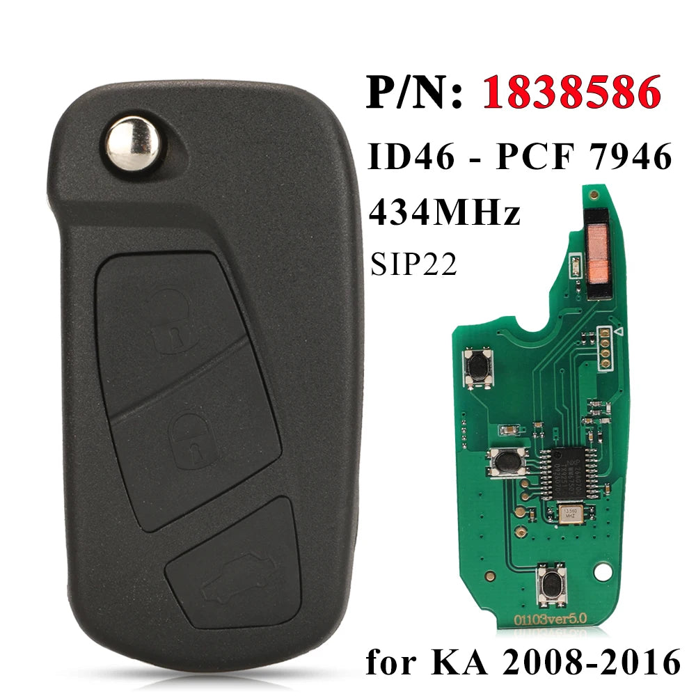 Ford Ka 3-Button Flip Key Fob 2008-2016, 433MHz ID46 Chip SIP22 Remote Control