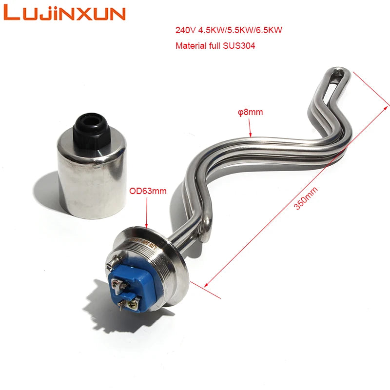 Enhance your water heating setup with this high-efficiency Electric Water Heater Element. Crafted from durable SUS304 stainless steel, it offers excellent acid and alkali resistance, ensuring longevity and reliability in various environments. With options of 4500W, 5500W, or 6500W power output, this element efficiently heats water, making it ideal for both residential and industrial use. Designed for a 240V connection with a tube diameter of 8mm and a length of 350mm, the element features a 2 Inch (OD64) Tri-clamp threading for secure fitting.