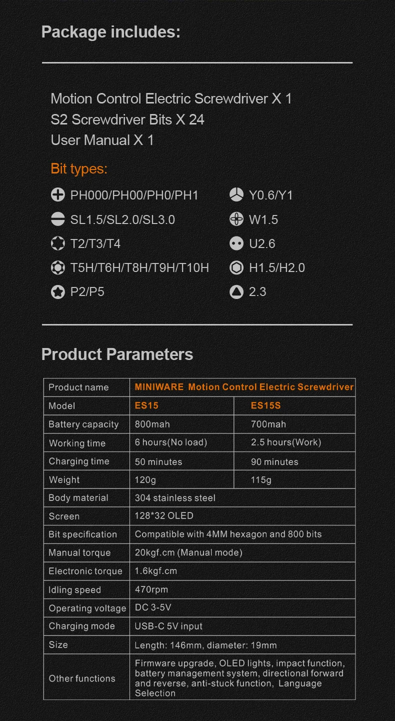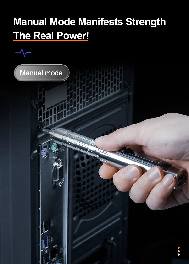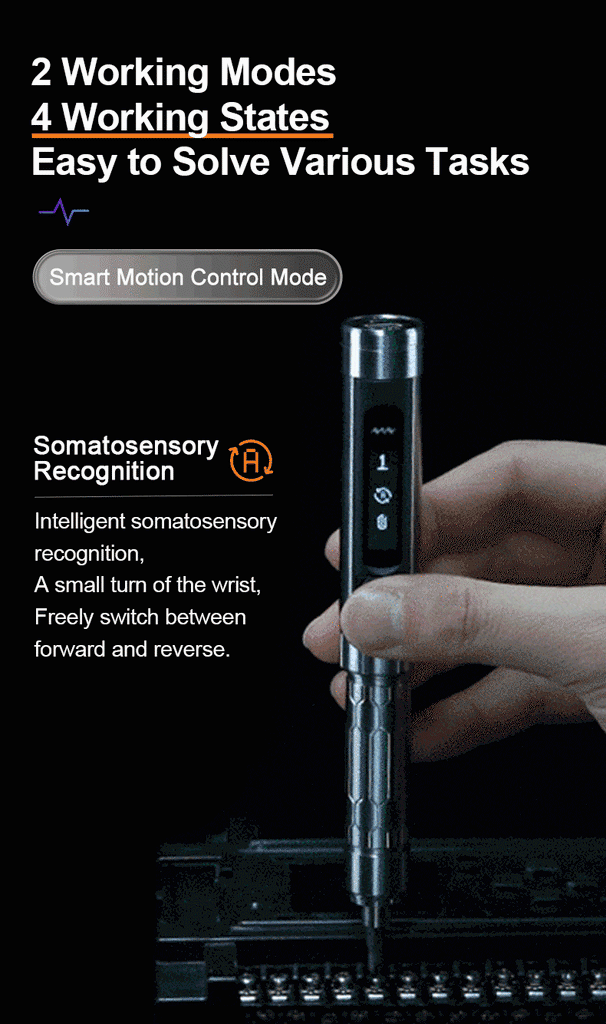 The ES15S Cordless Screwdriver is the perfect tool for home DIY enthusiasts. Designed with advanced technology, it offers intelligent body perception recognition and various working modes, including a directional mode for both forward and reverse functions. Its somatosensory recognition is ideal for quick repairs, while the directional mode tackles more demanding disassembly tasks with ease.