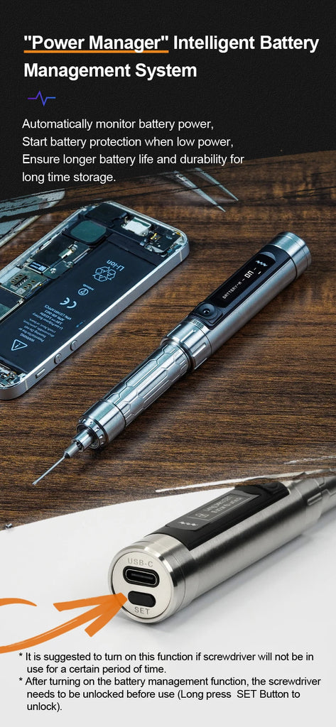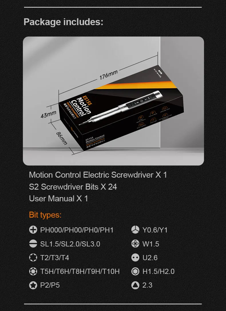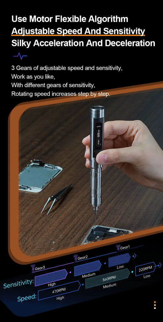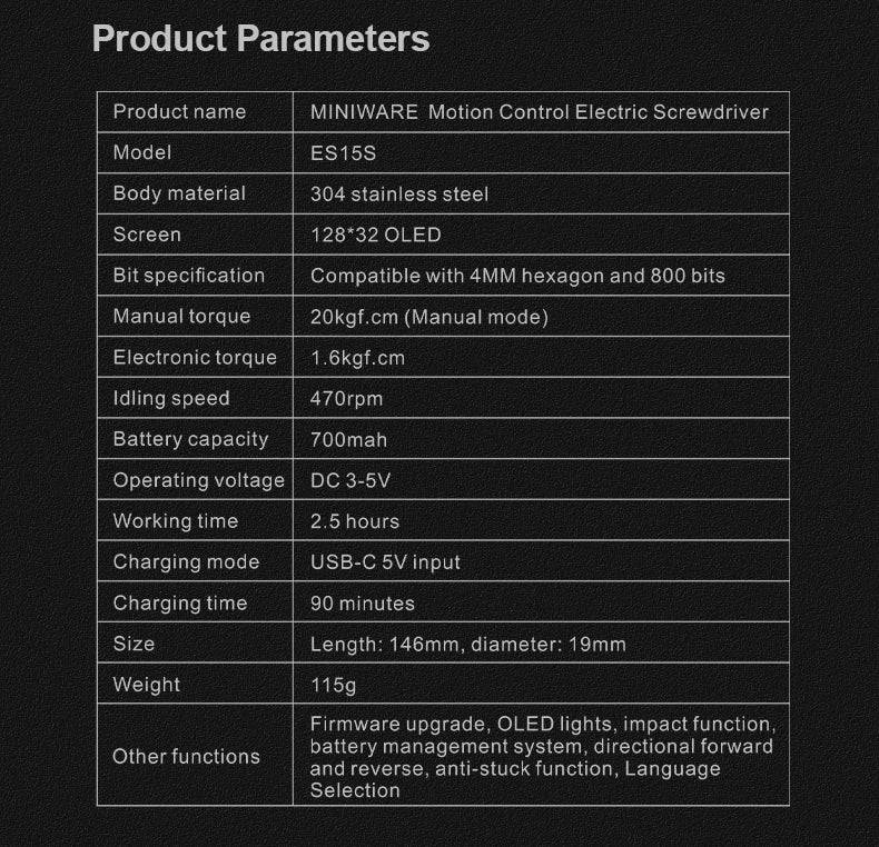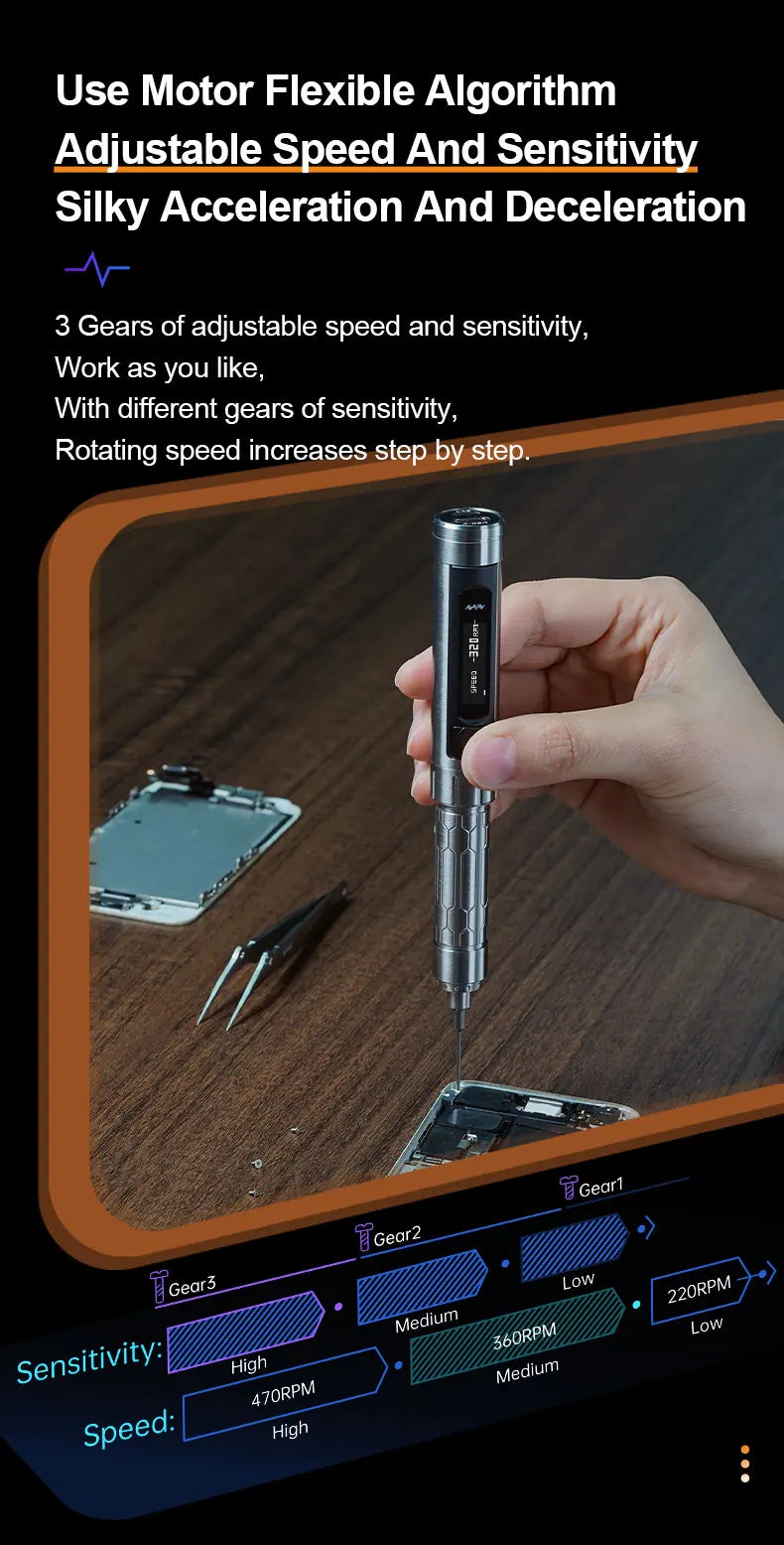 The ES15S Cordless Screwdriver is the perfect tool for home DIY enthusiasts. Designed with advanced technology, it offers intelligent body perception recognition and various working modes, including a directional mode for both forward and reverse functions. Its somatosensory recognition is ideal for quick repairs, while the directional mode tackles more demanding disassembly tasks with ease.