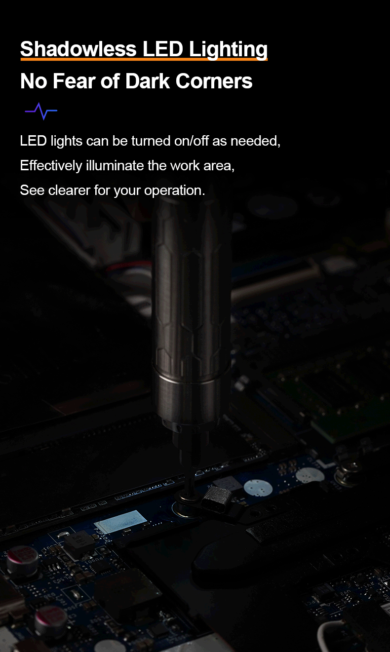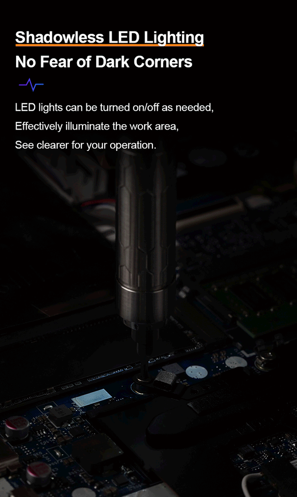 An upgraded power module featuring a coreless motor, planetary gear, and bidirectional overrunning clutch delivers robust power, while front shadowless lighting illuminates your workspace for added comfort.