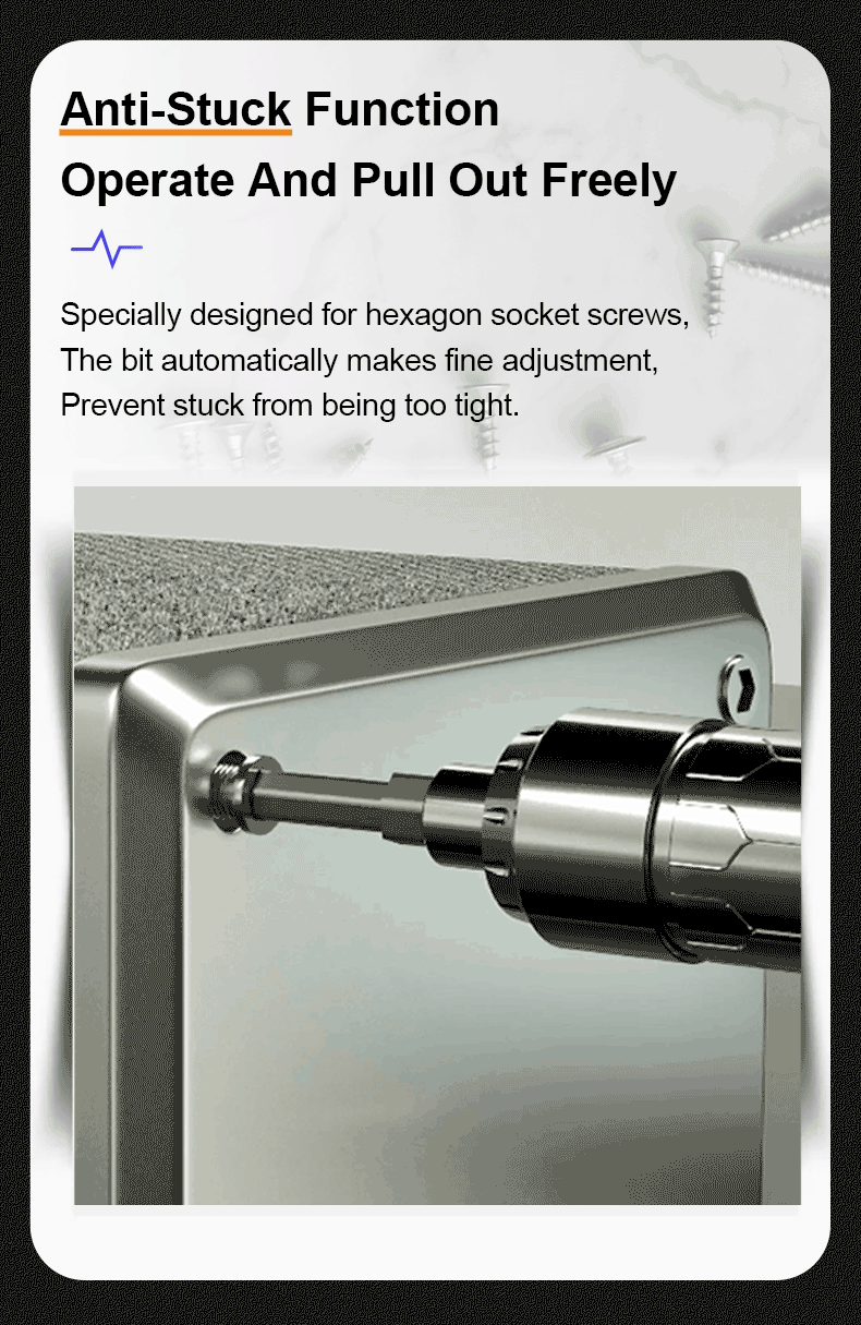 This screwdriver includes an anti-jamming function specifically designed for hexagon screws, preventing jams and ensuring smooth operation. The universal multi-specification bits, compatible with 4mm Allen and 800 bits, enhance versatility for various applications.