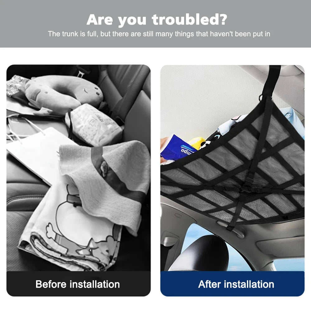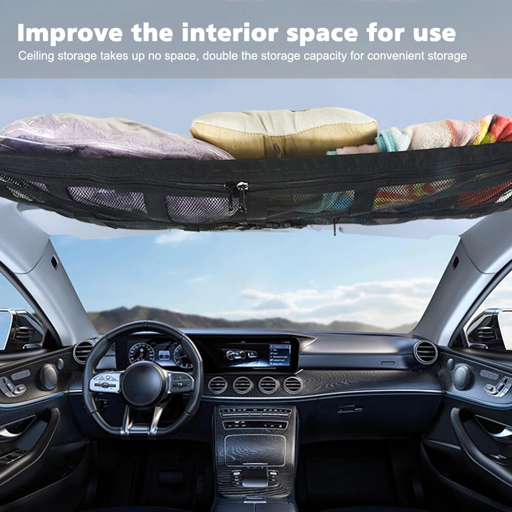 Introducing the ultimate solution for maximizing your vehicle's storage space: the Upgraded Car Ceiling Cargo Net. This innovative design features nine fixed reinforcement straps to secure your items effectively, preventing sagging or falling without obstructing your rearview mirror for safe driving. The double-layer mesh is equipped with additional pockets and a dual-end zipper, providing easy and accessible storage options for all your travel needs.