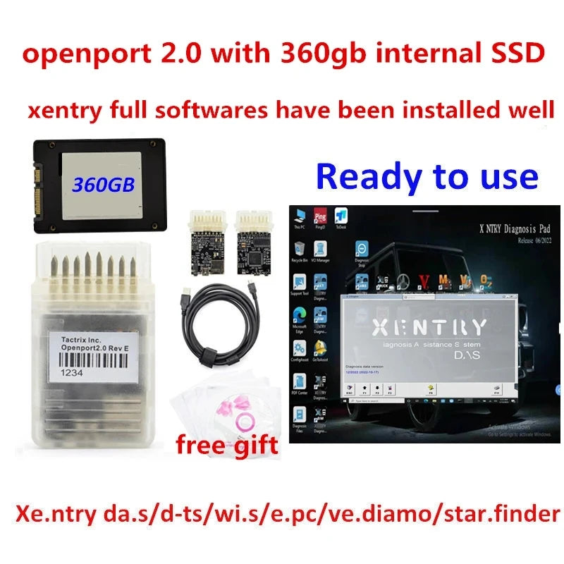 When purchasing, note that buying the Openport 2.0 + Xentry Software bundle includes the Openport 2.0 package, with remote installation assistance for the Xentry software on Windows 10 Pro 64-bit systems. For an all-in-one solution, opt for the Openport 2.0 + 360GB SSD package, which comes pre-installed with all necessary software—simply insert the SSD into your computer and contact us for activation.