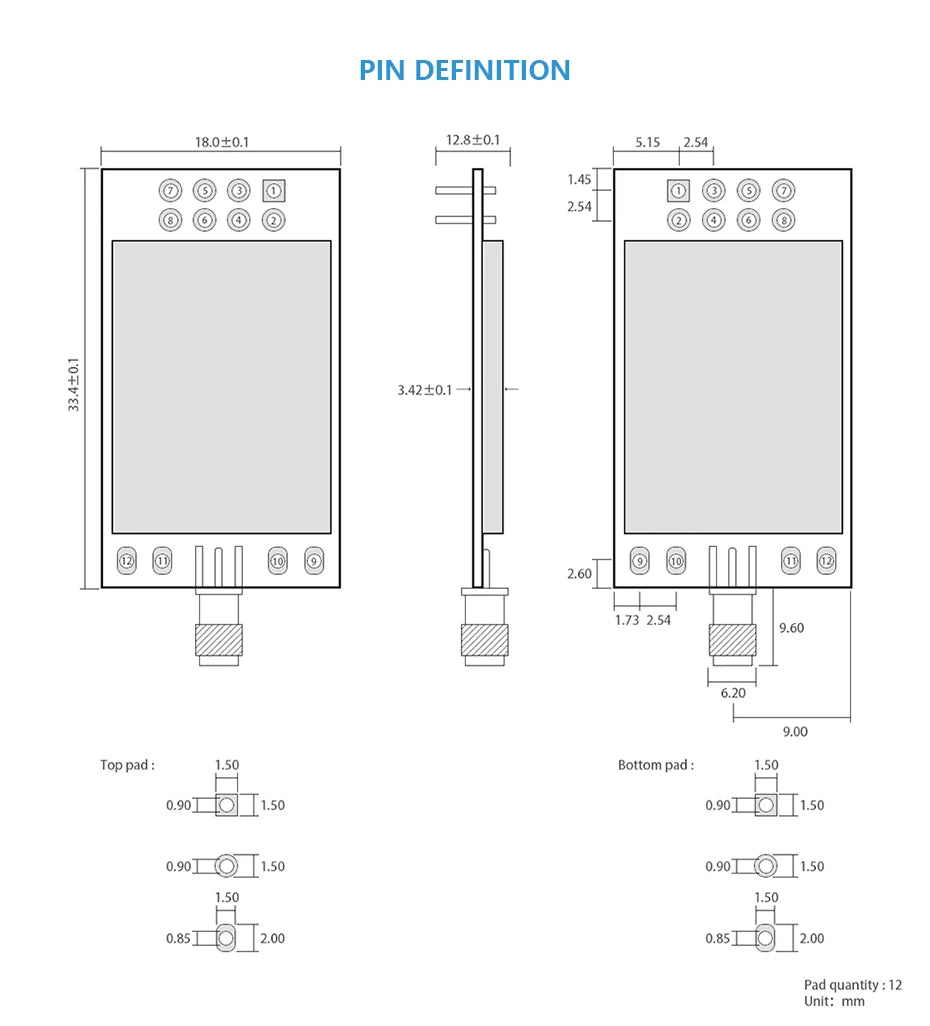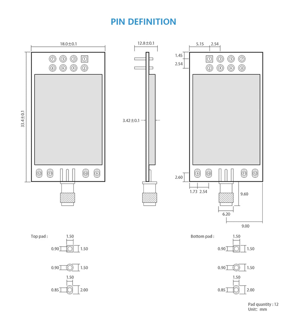 The compact design measures just 18 x 33.4 mm, allowing for easy integration into a variety of applications. Equipped with an SMA-K antenna interface and SPI communication, this module is tailored for optimal performance.