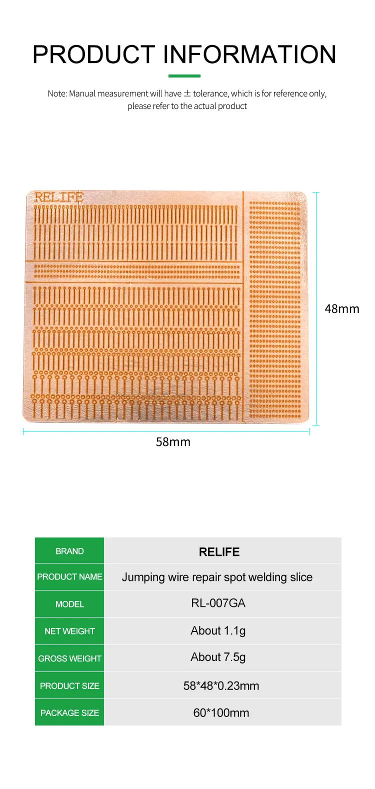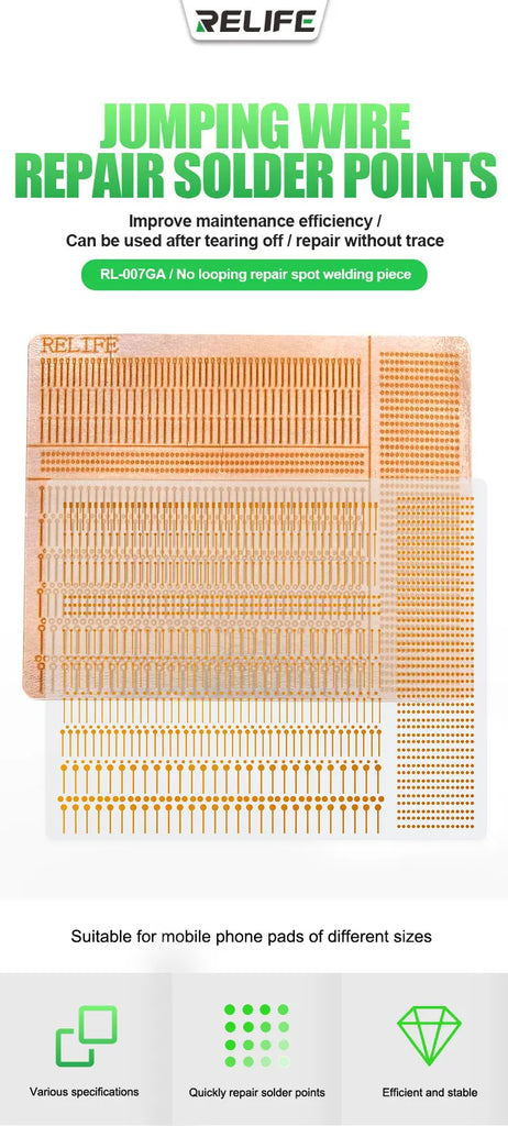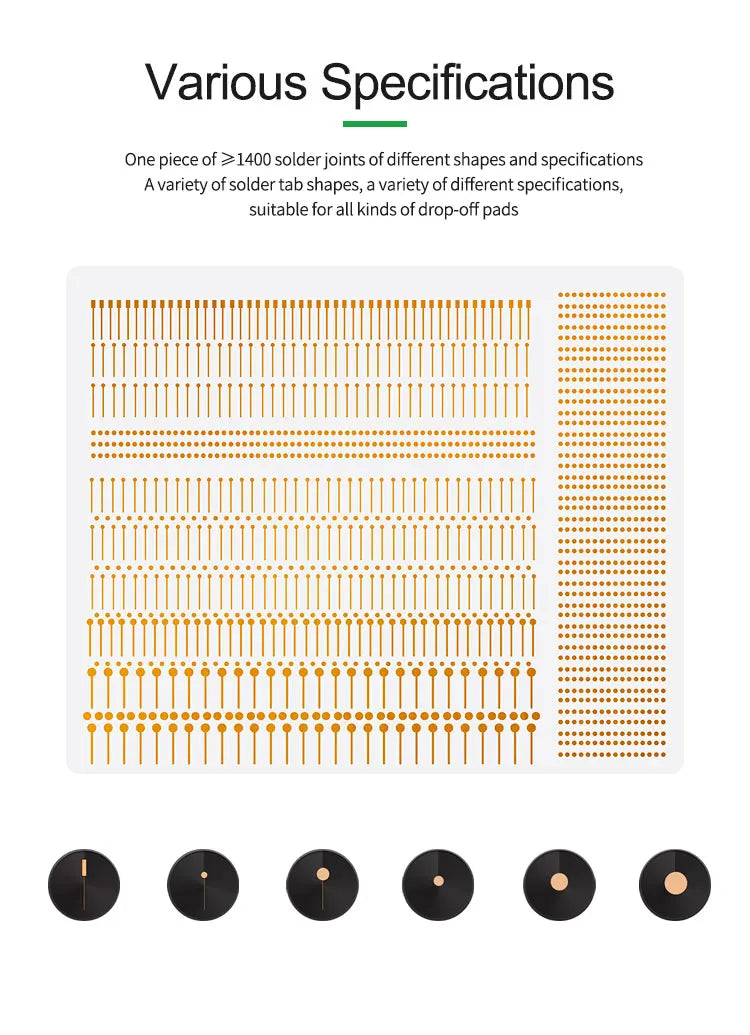 Introducing the RL-007GA Repair Spot Welding Slice, an affordable solution designed for quick and efficient patching. This versatile tool offers no looping repair, ensuring a seamless welding experience. With 10 different styles and a total of 1400 pieces, it caters to mobile phone pads of various sizes, making it adaptable for diverse repair needs.