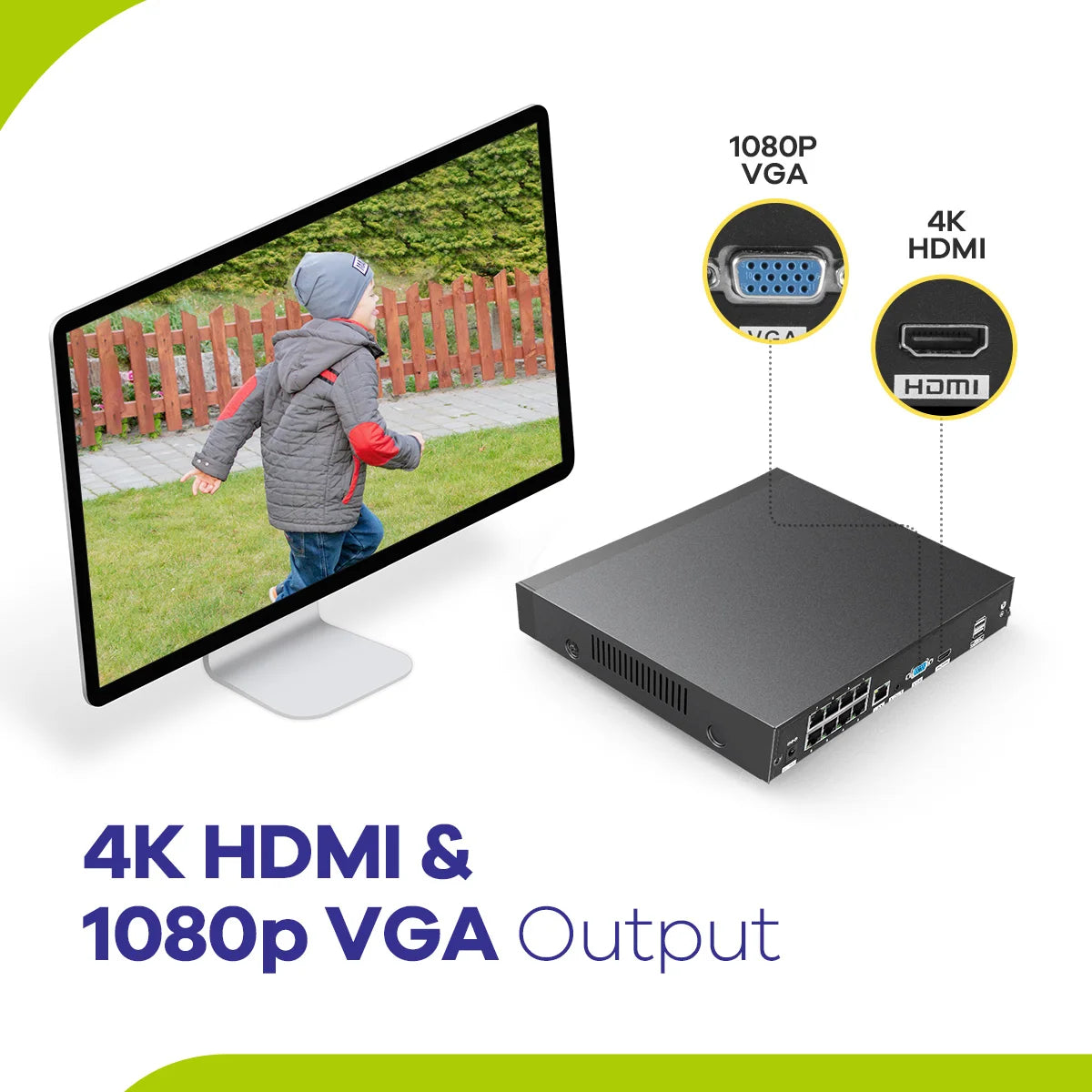 The NVR unit supports H.265+ video compression, maximizing storage space and extending recording time significantly compared to previous formats. The system includes 8 PoE ports, facilitating a true plug-and-play setup by simultaneously providing power, video, and internet connections through a single cable.