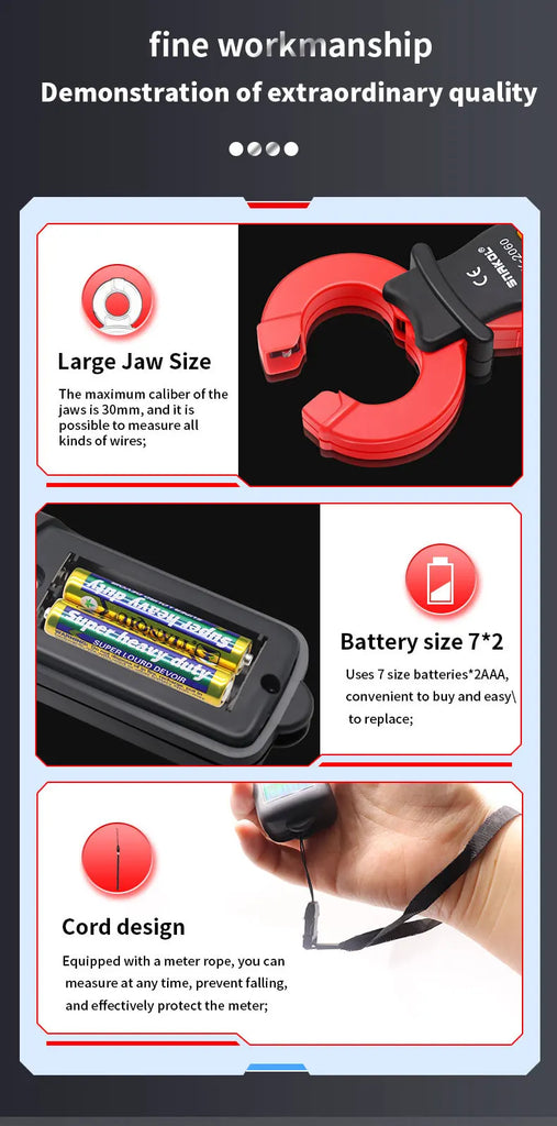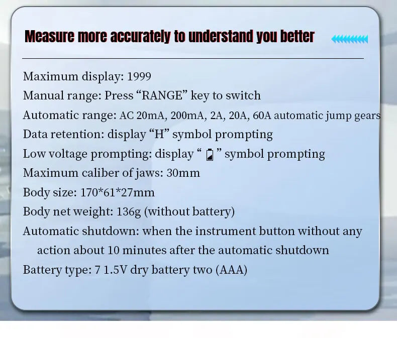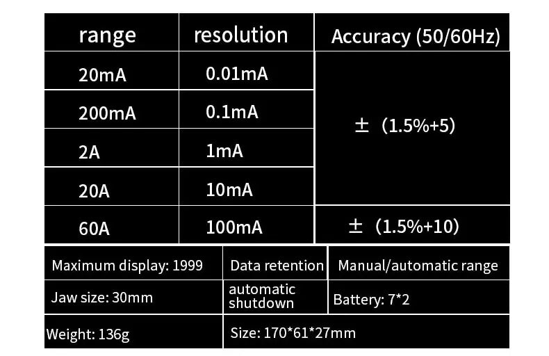 The clamp can open up to 30 mm, allowing it to work efficiently on various conductors. With a manual ranging option and data hold feature, it provides flexibility and accuracy for professional and DIY electrical tasks. For added convenience, the device includes an automatic shutdown function to conserve battery life.