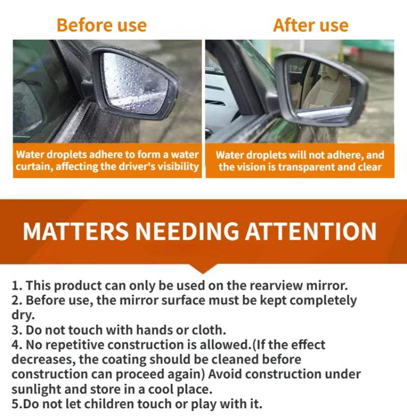 Enhance your driving experience with our cutting-edge Car Windshield Glass Water Rain Repellent. This advanced 70ml hydrophobic coating is designed to provide superior anti-rain treatment for your vehicle's glass, ensuring clear visibility and safety during adverse weather conditions. Its state-of-the-art formula forms a durable coating that withstands friction from wipers, dust, and cleaning agents, lasting six times longer than traditional coatings. Enjoy exceptional water repellency for up to one year.