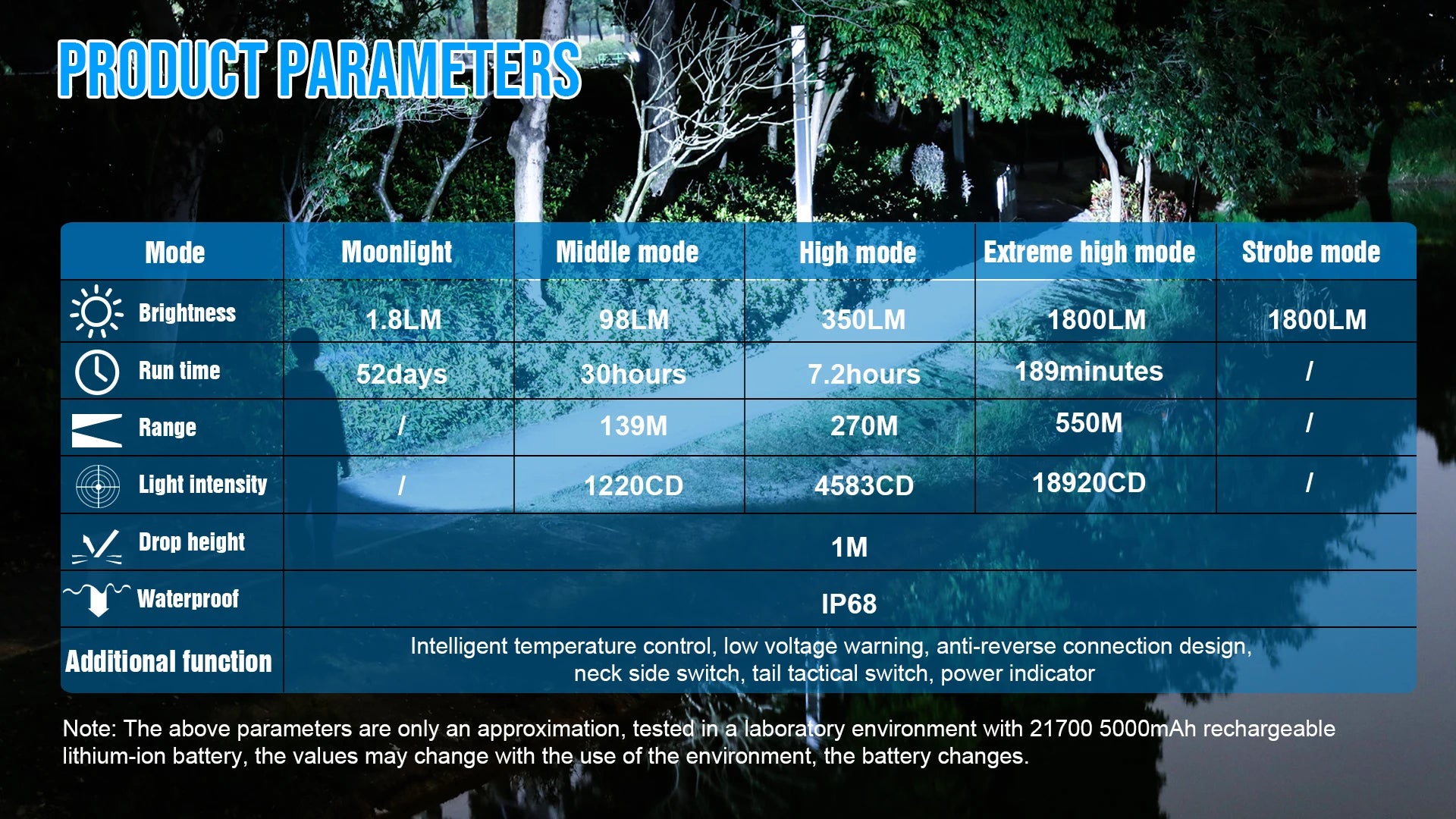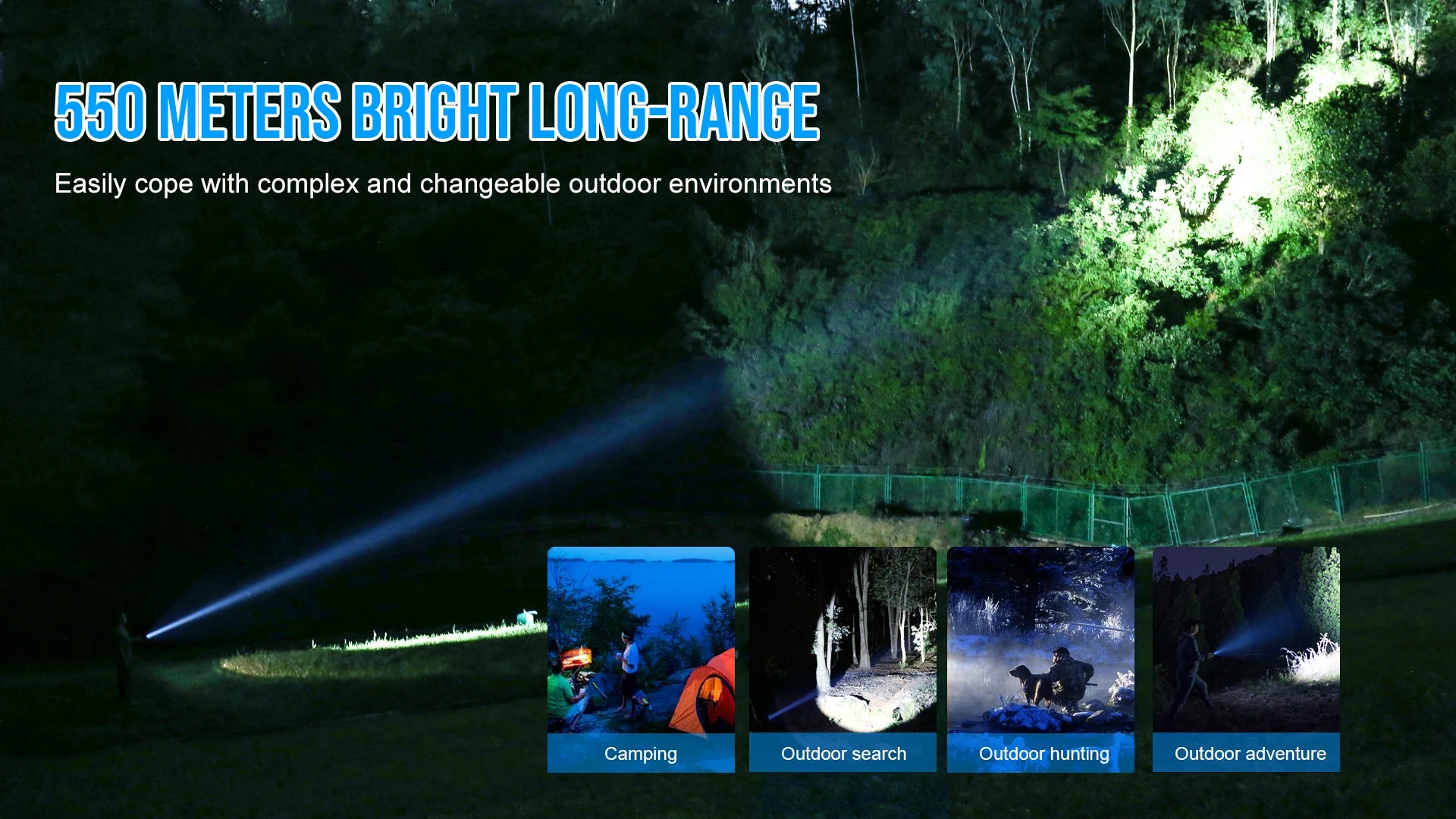 Introducing the Tactical LED Flashlight: Perfect for outdoor enthusiasts and those in need of reliable lighting. This flashlight is crafted from durable aluminum alloy and offers an impressive brightness with 1800 lumens, reaching a distance of over 500 meters. Its LED bulbs ensure longevity with a lifespan of up to 50,000 hours.