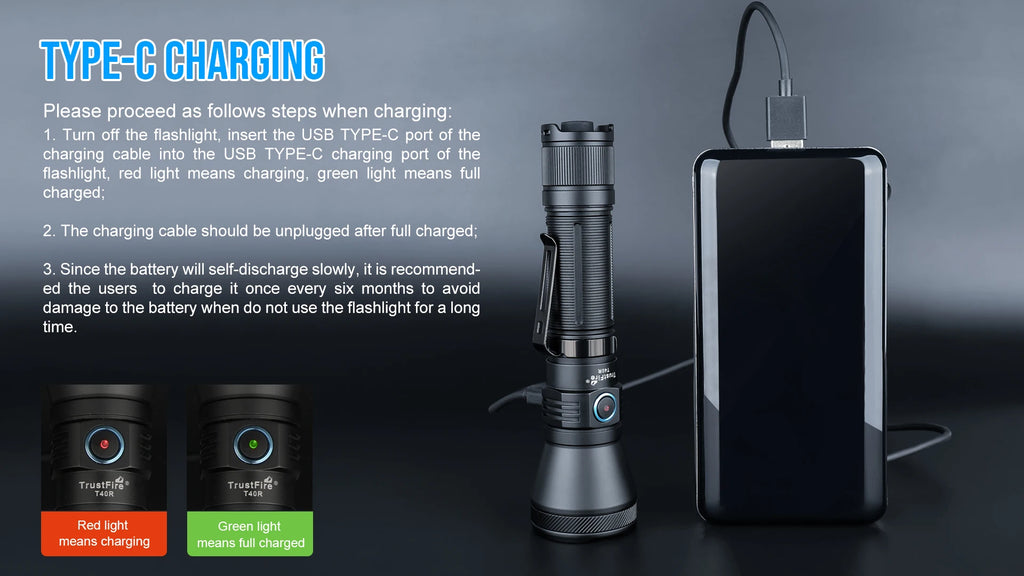 With IP68 waterproof certification, this flashlight is dustproof and operable underwater up to 2 meters. The rechargeable design includes a convenient USB Type-C port, providing a clear battery level indicator so you're never caught off guard.