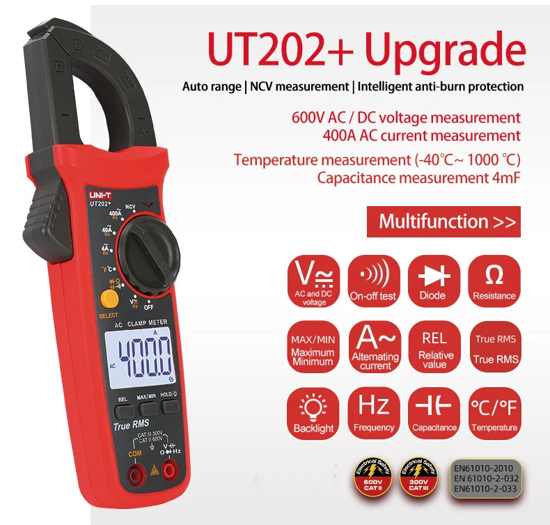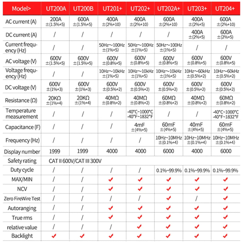 - Capacitance Range: 4mF (UT202+), 40mF (UT203+)
