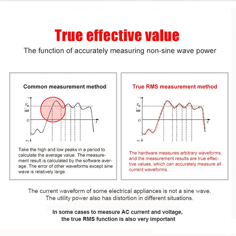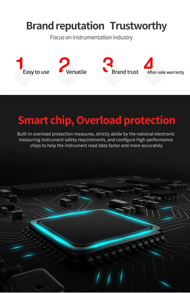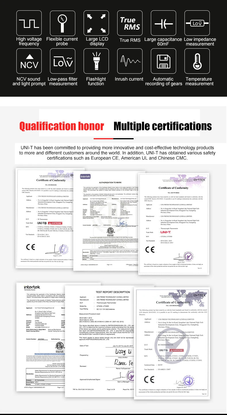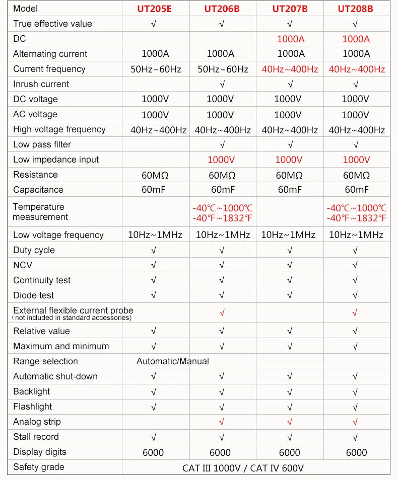 The UT206B, UT207B, and UT208B models are equipped with LoZ mode to eliminate ghost voltage, an LPF ACV function for precise INV and VFD voltage measurement, and an inrush current mode for capturing transient current. Additionally, the UT206B and UT208B models offer high-precision temperature measurement with a 0.1°C resolution and compatibility with a flexible current probe to measure AC currents up to 3000A.