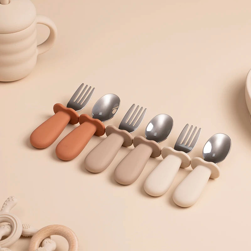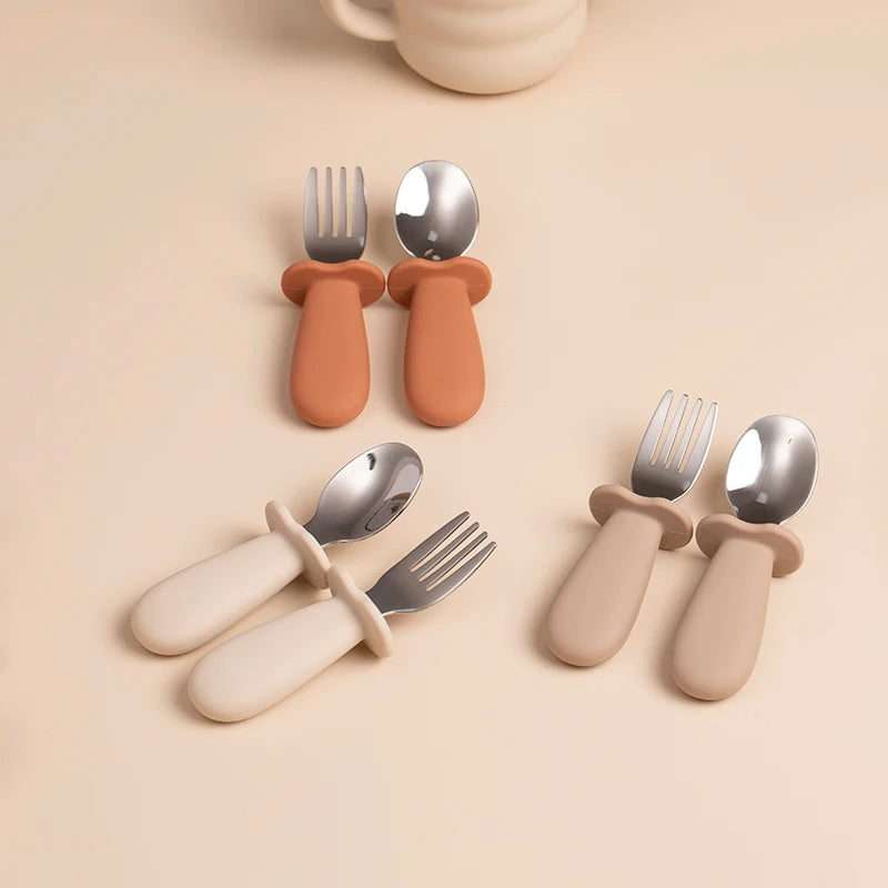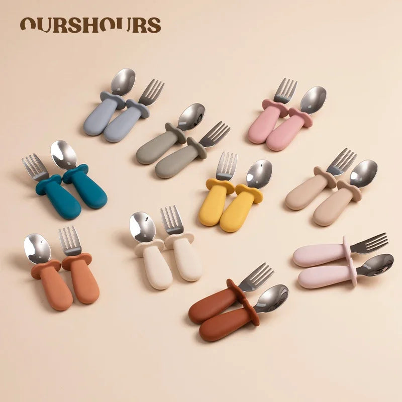 Baby Spoon & Fork Set: Silicone Handle, Stainless Steel Utensils for Infant/Toddler Feeding - 2pcs